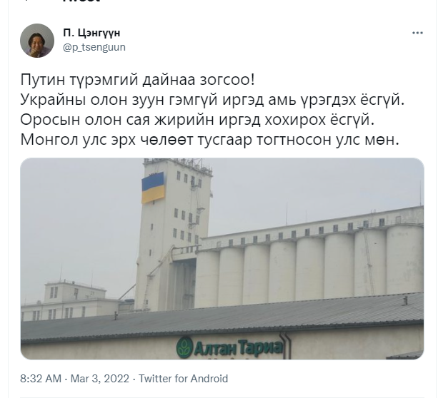 “Алтан тариа “компанийн захирал П.Цэнгүүн  “Путин түрэмгий дайнаа зогсоо! Украйны олон зуун гэмгүй иргэд амь үрэгдэх ёсгүй.