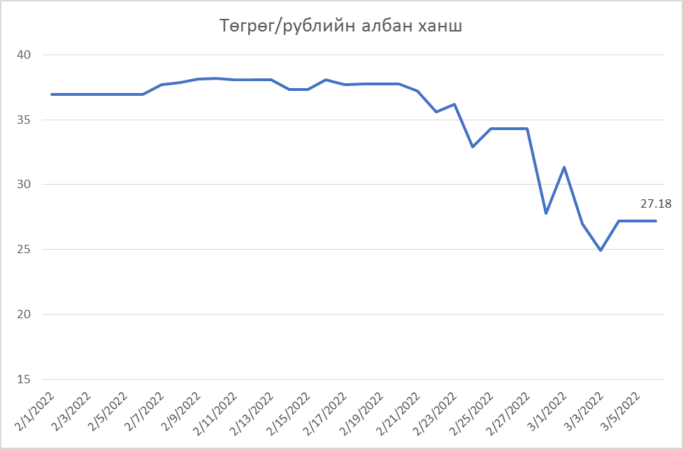 ОХУ болон УКРАИН хоорондын дайн эхэлснээс хойш ОХУ-ын рубль дэлхийн бүх валютуудын эсрэг суларч байгаа бөгөөд. ОХУ-ын рублийн ханш сүүлийн нэг сарын хугацааны хамгийн өндөр түвшинтэй харьцуулахад 28.6 хувиар суларсан үзүүлэлт болж байна. Рубль төгрөгийн эсрэг өнөөдрийн байдлаар 27.18 төгрөгтэй тэнцэж байна