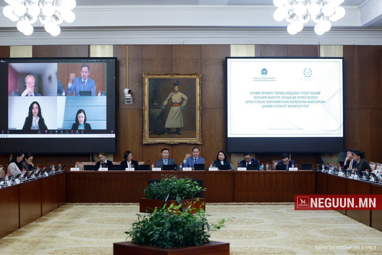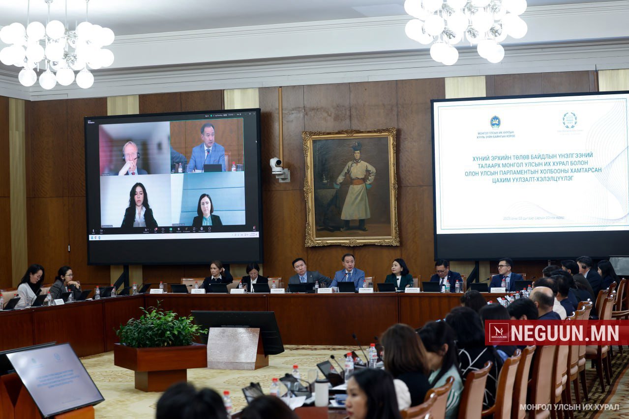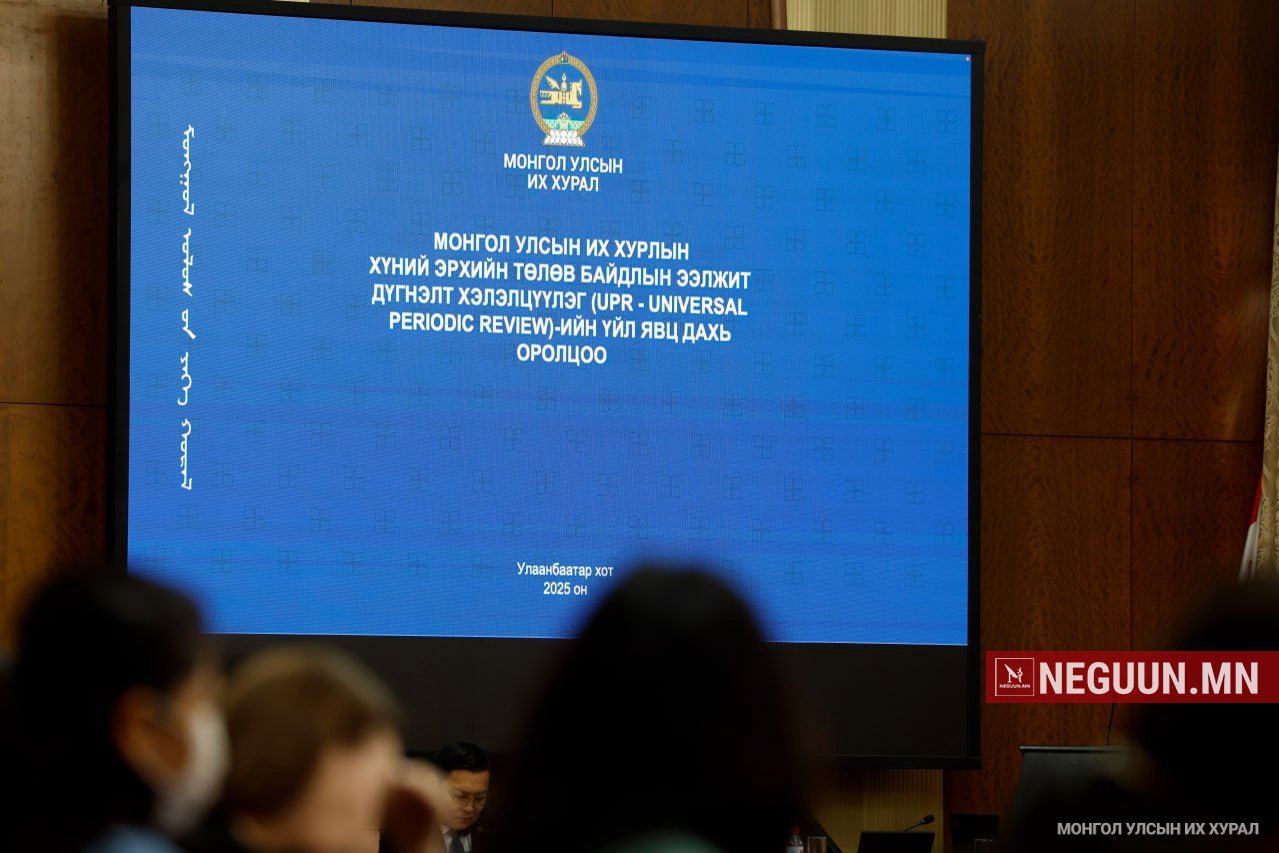Монгол Улсын Их Хурлаас Олон улсын парламентын холбоо (ОУПХ)-той хамтран зохион байгуулж буй Нэгдсэн Үндэстний Байгууллага (НҮБ)-ын хүний эрхийн механизмуудад парламентын оролцоог бэхжүүлэх асуудлаарх өнөөдрийн (2025.06.23) уулзалт-хэлэлцүүлэг Төрийн ордонд үргэлжилж байна. Уулзалт-хэлэлцүүлгийн чиглүүлэгчээр Улсын Их Хурлын гишүүн Г.Уянгахишиг ажиллаж байгаа бөгөөд Төрийн байгуулалтын байнгын хорооны дарга Ж.Бат-Эрдэнэ, Хууль зүйн байнгын хорооны дарга Д.Цогтбаатар нар арга хэмжээг нээж үг хэлсэн бол Олон улсын парламентын холбооны Ерөнхий нарийн бичгийн дарга Мартин Чунгон мэндчилгээ дэвшүүлсэн. Хоёр өдөр үргэлжлэх уулзалт-хэлэлцүүлгийн эхний өдөр нийт таван сэдвээр хэлэлцүүлэг өрнүүлэх юм. Нээлтийн арга хэмжээний дараа Монгол Улс, НҮБ-ын хүний эрхийн хяналтын байгууллагууд, Хүний эрхийн төлөв байдлын ээлжит нэгдсэн хэлэлцүүлэг болов. Эхлээд НҮБ-ын Эмэгтэйчүүдийг алагчлах бүх хэлбэрийг устгах тухай конвенцын хорооны ерөнхийлөгч болон гишүүн асан; ОУПХ-ны Эмэгтэйчүүдийг алагчлах бүх хэлбэрийг устгах тухай конвенцын асуудлаарх шинжээч; Бүгд Найрамдах Гана Улсын Хуулийн хүрээлэнгийн ректор Хилари Гбедемах НҮБ-ын хүний эрхийн гэрээ, механизмуудын талаар илтгэл танилцуулав. Энэ удаагийн уулзалт-хэлэлцүүлгийн сэдэв, зорилгын талаар болон хүний эрхийн суурь баримт бичгүүдийн талаар ерөнхий мэдээлэл танилцуулсан. НҮБ-ын Хүний эрхийн зөвлөл, ялангуяа Хүний эрхийн төлөв байдлын ээлжит нэгдсэн хэлэлцүүлэг (UPR), болон Эмэгтэйчүүдийг алагчилах бүх хэлбэрийг устгах хорооны (CEDAW хороо) үйл ажиллагаан дахь парламентын ойлголт мэдлэг, оролцоог нэмэгдүүлэх нь чухал болохыг тэрбээр тэмдэглэв. Хүний эрхийн баримт бичгүүдийн суурь болох НҮБ-ын Дүрэм нь 1945 онд зургаан хэлээр батлагдсан хэмээгээд “Эдийн засаг, нийгэм, соёл болон хүмүүнлэгийн шинж чанартай олон улсын асуудлыг шийдвэрлэх, арьсны өнгө, хүйс, хэл, шашин шүтлэгээр үл ялган хүний эрх, хэн бүхний үндсэн эрх чөлөөг хүндэтгэх явдлыг хөхиүлэн дэмжиж, хөгжүүлэх талаар олон улсын хамтын ажиллагааг хэрэгжүүлэх” гэсэн нэгдүгээр зүйлийн 3 дахь хэсгийг хатагтай Хилари Гбедемах онцлон эшлэв. Түүнчлэн 1948 онд батлагдсан Хүний эрхийн Түгээмэл Тунхаглал нь чухал суурь баримт бичиг хэмээгээд “Хүн бүр төрөхөөсөө эрх чөлөөтэй, нэр төр, эрхийнхээ хувьд адил тэгш байна. Тэдэнд оюун ухаан, өрлөг сэтгэл заяасан бөгөөд өөр хоорондоо ахан дүүгийн ёсоор харилцах ёстой” гэсэн нэгдүгээр зүйлийг онцоллоо. Жендэрийн тэгш байдлыг хангах агуулгаар энэ зүйлд “…эгч дүүсийн харилцаа …” гэсэн тодотгол хийх саналаа дурдав. Энэхүү зарчимд тулгуурласан дээрх суурь баримт бичгүүд нь хүний эрхтэй холбоотой олон улсын бусад бүх баримт бичиг, хууль, журмын үндэс гэдгийг дурдсан. Илтгэгч хүний эрхийн талаар ерөнхий мэдээллийг танилцуулаад хүний үндсэн эрх болон нийгмийн нийтлэг эрхийг олон улсын гэрээ, конвенц, улс бүр Үндсэн хуульдаа баталгаажуулсан байдгийг хэллээ. Олон улсын холбогдох гэрээ, конвенцуудыг соёрхон баталсан гишүүн орнууд тэдгээрийн зохицуулалтыг хууль тогтоомж лугаа дагаж мөрдөх үүрэг хүлээсэн байдгийг тодотгов. Хүний эрх нь нийгмийн бүх талбарт хэрэгжих байх ёстой бөгөөд Иргэний болон улс төрийн эрх ; Эдийн засаг, нийгэм, соёлын эрх болон н ийгмийн нийтлэг эрхүүд (коллектив эрх)-ийг онцолсон. Хүний эрх нь хүн нэг бүрд хамааралтай түгээмэл, хуваагдашгүй, салшгүй бөгөөд харилцан х