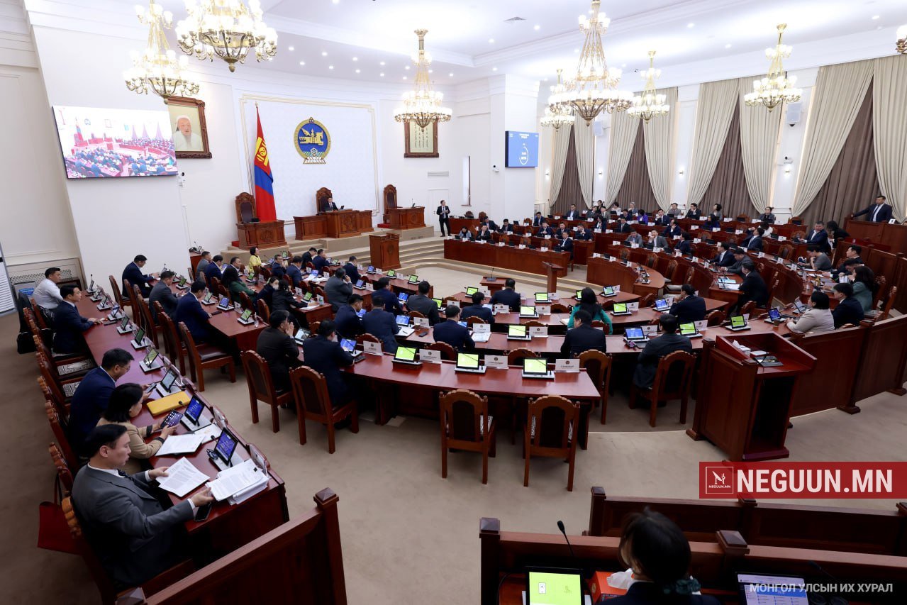 Улсын Их Хурлын 2025 оны хаврын ээлжит чуулганы өнөөдрийн /2025.05.26/ нэгдсэн хуралдаан 11 цаг 22 минутад, гишүүдийн 79.4 хувийн ирцтэй эхлэв. Хуралдааны эхэнд Засгийн газраас 2025 оны 05 дугаар сарын 09-ний өдөр өргөн мэдүүлсэн Хот, тосгоны эрх зүйн байдлын тухай хууль /Шинэчилсэн найруулга/-д өөрчлөлт оруулах тухай хуулийн төсөл болон хамт өргөн мэдүүлсэн хууль, тогтоолын төслүүдийн анхны хэлэлцүүлгийг үргэлжлүүлэв. Улсын Их Хурлын чуулганы 2025 оны 05 дугаар сарын 23-ны өдрийн нэгдсэн хуралдаанаар хууль, тогтоолын төслүүдийн анхны хэлэлцүүлгийг явуулж, Байнгын хорооны санал, дүгнэлттэй холбогдуулан гишүүд асуулт асууж, санал хэлсэн. Иймд энэ өдрийн хуралдаанаар хууль, тогтоолын төслүүдийн анхны хэлэлцүүлгийг эцэслэн батлах үе шатруу шилжүүлэх Байнгын хорооны горимын саналаар санал хураалтыг явуулав. Уг саналыг хуралдаанд оролцсон гишүүдийн 82.4 хувь нь дэмжсэн тул үргэлжлүүлэн Монгол Улсын Их Хурлын чуулганы хуралдааны дэгийн тухай хуулийн 44 дүгээр зүйлийн 44.2-т “Нэгдсэн хуралдаанд хуулийн төслийг эцэслэн батлах санал хураалт явуулах бөгөөд Улсын Их Хурлын нийт гишүүний олонх дэмжсэн бол эцэслэн баталсанд тооцно.” гэсний дагуу санал хураав. Ингээд Хот, тосгоны эрх зүйн байдлын тухай хуульд өөрчлөлт оруулах тухай хуулийн төсөл болон хамт өргөн мэдүүлсэн хууль, тогтоолын төсөл тус бүрээр эцэслэн батлах санал хураалтыг явуулахад, Улсын Их Хурлын нийт гишүүдийн олонх дэмжлээ. Дараа нь Сонгуулийн ерөнхий хорооны гишүүнээс чөлөөлөх тухай асуудлыг хэлэлцсэн. Монгол Улсын Их Хурлын чуулганы хуралдааны дэгийн тухай хуулийн 111 дүгээр зүйлийн 111.2-т “Нэгдсэн хуралдаан эрх бүхий албан тушаалтны санал, холбогдох Байнгын хорооны санал, дүгнэлтийг сонсож нууц санал хураалт явуулж хуралдаанд оролцсон гишүүдийн олонх томилох, чөлөөлөх саналыг дэмжсэн бол энэ тухай тогтоол баталсанд тооцно.” гэсний дагуу санал хураалтыг нууцаар явуулсан. Д.Дэлгэрсайханыг өөрийнх нь гаргасан хүсэлтийн дагуу Сонгуулийн ерөнхий хорооны гишүүнээс чөлөөлөх саналыг дэмжье гэдэг саналын томьёоллоор санал хураахад, хуралдаанд оролцсон гишүүдийн олонх дэмжив. Хуралдаан Засгийн газраас 2025 оны 03 дугаар сарын 26-ны өдөр өргөн мэдүүлсэн, Зөвшөөрлийн тухай хуульд нэмэлт, өөрчлөлт оруулах тухай хуулийн төсөл болон хамт өргөн мэдүүлсэн хуулийн төслүүдийн анхны хэлэлцүүлгээр үргэлжиллээ. Улсын Их Хурлын чуулганы 2025 оны 05 дугаар сарын 23-ны өдрийн хуралдаанаар хуулийн төслүүдийн анхны хэлэлцүүлгийг явуулж, Байнгын хорооны санал, дүгнэлттэй холбогдуулан гишүүд асуулт асууж, байр сууриа илэрхийлсэн. Өнөөдрийн нэгдсэн хуралдаанаар хуулийн төслүүдийн талаарх зарчмын зөрүүтэй таван саналаар санал хураалт явуулахад, хуралдаанд оролцсон гишүүдийн олонх дэмжлээ. Тухайлбал, Эрүүгийн хуульд нэмэлт оруулах тухай хуулийн төслийн 1 дүгээр зүйлд төлбөрт таавар, бооцоот тоглоомын үйл ажиллагаа эрхлэхтэй холбоотойгоор “Олон нийтийн газар, эсхүл мэдээллийн технологи ашиглан ашиг олох зорилгоор төлбөрт таавар, эсхүл бооцоот тоглоом зохион байгуулсан бол хоёр мянга долоон зуун нэгжээс арван дөрвөн мянган нэгжтэй тэнцэх хэмжээний төгрөгөөр торгох, эсхүл хоёр зуун дөчин цагаас долоон зуун хорин цаг хүртэл хугацаагаар нийтэд тустай ажил хийлгэх, эсхүл зургаан сараас гурван жил хүртэл хугацаагаар зорчих эрхийг хязгаарлах, эсхүл зургаан сараас гурван жил хүртэл хугацаагаар хорих 