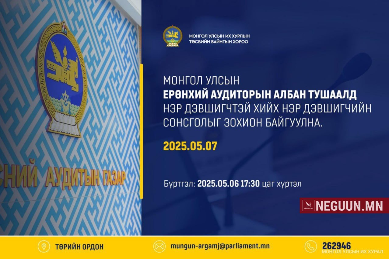 Монгол Улсын Ерөнхий аудиторын албан тушаалд нэр дэвшигчтэй хийх нэр дэвшигчийн сонсголыг зохион байгуулна