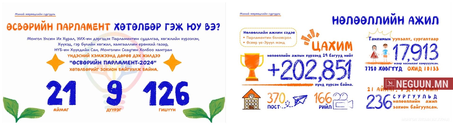 Хүүхдийн эсрэг гэмт хэрэг, хүчирхийллийн өнөөгийн нөхцөл байдал болон цаашид анхаарах асуудлын талаар Хүүхдийн төлөө үндэсний зөвлөлийн гишүүн, ХЭҮК-ын дэргэдэх иргэний нийгмийн зөвлөлийн гишүүн, Хүүхэд хүчирхийлэхийн эсрэг үндэсний хөдөлгөөний ерөнхий зохицуулагч, "Үжин төв"-ийг үүсгэн байгуулагч, Хамтарсан багийн үндэсний сургагч, зөвлөх Д.Ундраатай ярилцлаа. -Сүүлийн жилүүдэд хүүхэд хамгааллын чиглэлд төрөөс хэрхэн анхаарч ажиллаж байна вэ? Өнөөгийн нөхцөл байдал ямар байна вэ? Төрийн туслалцаа, дэмжлэг эзэндээ хүрч чадаж байна уу? -Манай улс нийт 3.5 сая хүнтэй. Үүний 38 хувь нь буюу 1.3 сая нь хүүхэд. Монгол Улсын нийт хүүхдийн 25-30 орчим хувь буюу 370.000 мянга гаруй хүүхдүүд зайлшгүй төрийн туслалцаа, дэмжлэг, хамгаалал шаардлагатай нөхцөлд амьдарч байна. Жишээ нь: Улсын хэмжээнд хөдөлмөр эрхэлдэг 138,000 хүүхэд байгаагаас 58,380 хүүхэд нь аюултай хөдөлмөр эрхэлж байна. Төрөөс олгодог хүнсний талонд хамрагддаг 47,530 хүүхэд /сар бүр 8000 төгрөг/ халамжаас олгодог мөнгөн тусламж авдаг 13,000 мянган орчим хүүхэд байна. Монгол улсад хүүхдийн ядуурал нэмэгдэж 5 хүүхэд тутмын 2 нь хоол шим тэжээл, боловсролын доройтол, хүүхдийн ядууралд өртсөөр байгааг НҮБ-ын Хүүхдийн сангийн суурин төлөөлөгч Эваристе Коуасси Комлан 5 дугаар сарын 23 ны өдөр мэдээлсэн. Засгийн газар хүүхдийн салбараар сүүлийн жилүүдэд тоглож намынхаа цүнх баригчдын даргын дамжаа болгож 6 жилийн дотор 6,7 даргын түр орлон гүйцэтгэгчийн нүүр үзэж буй нь ил болсон асуудал. Хүүхэд хамгаалалд төсөвлөсөн мөнгийг хамгаалал шаардлагатай хүүхдэд зарцуулдаггүй зөвлөгөөн, семинар, сургалт, цугларалт нэрээр үргүй зарцуулдаг. 2020-2023 онд 8 тэрбум, 2024 онд Хүүхэд хамгааллын зардалд 14,3 тэрбум төгрөгийг төсөвлөсөн боловч зориулалтын бусаар үр дүнгүй зарцуулж одоо 8 тэрбум төгрөгийг зарцуулсан талаарх мэдээлэлтэй байна. 2024 оны 3 дугаар улирал дундаа ороод явж байхад Улсын хэмжээнд гэр бүл, хүүхдийн эсрэг гэмт хэрэг, хүчирхийлэлтэй тэмцэж ажилладаг сум, баг, хорооны 830 гаруй Хамтарсан багт кейс шийдвэрлэлтийн зардлыг нийслэл, дүүрэг, аймгийн Хүүхэд гэр бүлийн хөгжил хамгааллын газраас журмын дагуу олгоогүй байна. 2024 оны 1-4 дүгээр сард цас зуд, 5 дугаар сараас төрийн албан хаагчид нэр дэвшигчийг сурталчлах ажилд аймаг, дүүрэг, сум, хороо, баггүй явж ажилласныг хэн хүнгүй мэдэж байгаа. Монгол улсад Хүүхдийн эсрэг бэлгийн хүчирхийлэл, охидын хүсээгүй төрөлт, жирэмслэлт, үр хөндөлт, хүн худалдаалах гэмт хэргийн хохирогч, бэлгийн, хөдөлмөрийн мөлжлөг, хүүхдийн эсрэг гэмт хэрэг, зөрчил, хүчирхийлэл нэмэгдэж, өдөр болгон хүүхдийн эсрэг хүчирхийллийн гэмт хэрэг, зөрчил гарсаар байвч дорвитой урьдчилан сэргийлэх, соён гэгээрүүлэх, хохирогч хүүхдүүдийг хамгаалах, хариу үйлчилгээ үзүүлэх ажлыг хийлгүй өдөр хоногийг өнгөрөөсөөр, бэлгийн хүчирхийллийн хохирогч хүүхдийг урт хугацаанд нөхөн сэргээх, эрүүл мэнд, нийгэм-сэтгэл зүй, сэтгэл заслын эмчилгээг нэг дороос үзүүлдэг Төрийн ганц төв одоо болтол байгуулаагүй, хохирогч хүүхдэд үзүүлэх хүүхэд хамгааллын хариу үйлчилгээний чанар, хүртээмж, салбар хоорондын уялдаа холбоо гэж ярихаас ч ичмээр байна. Нэгдүгээрт_Хүүхэд, Бүхнийг_Хүүхдийн_Төлөө Хоосон лоозонгоо хэзээ ажил хэрэг болгох юм бол доо төр маань. 12 насандаа 2 дахь удаагаа үр хөндүүлэх гээд явж байгаа охины талаарх эмэгтэйчүүдийн эмчийн яриаг энэ хаваржин хэн хүнгүй сонссон боловч Төр ч тэр хэн ч ю