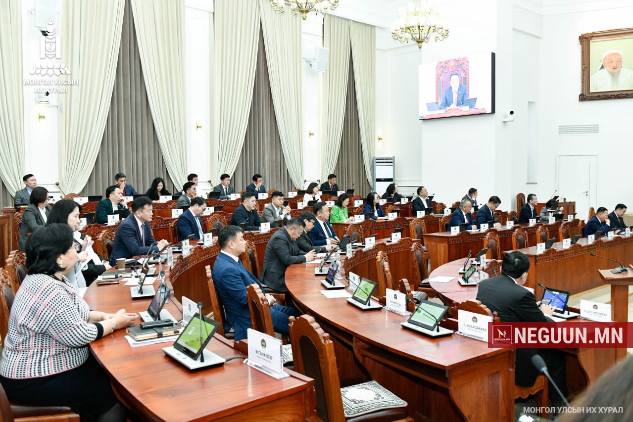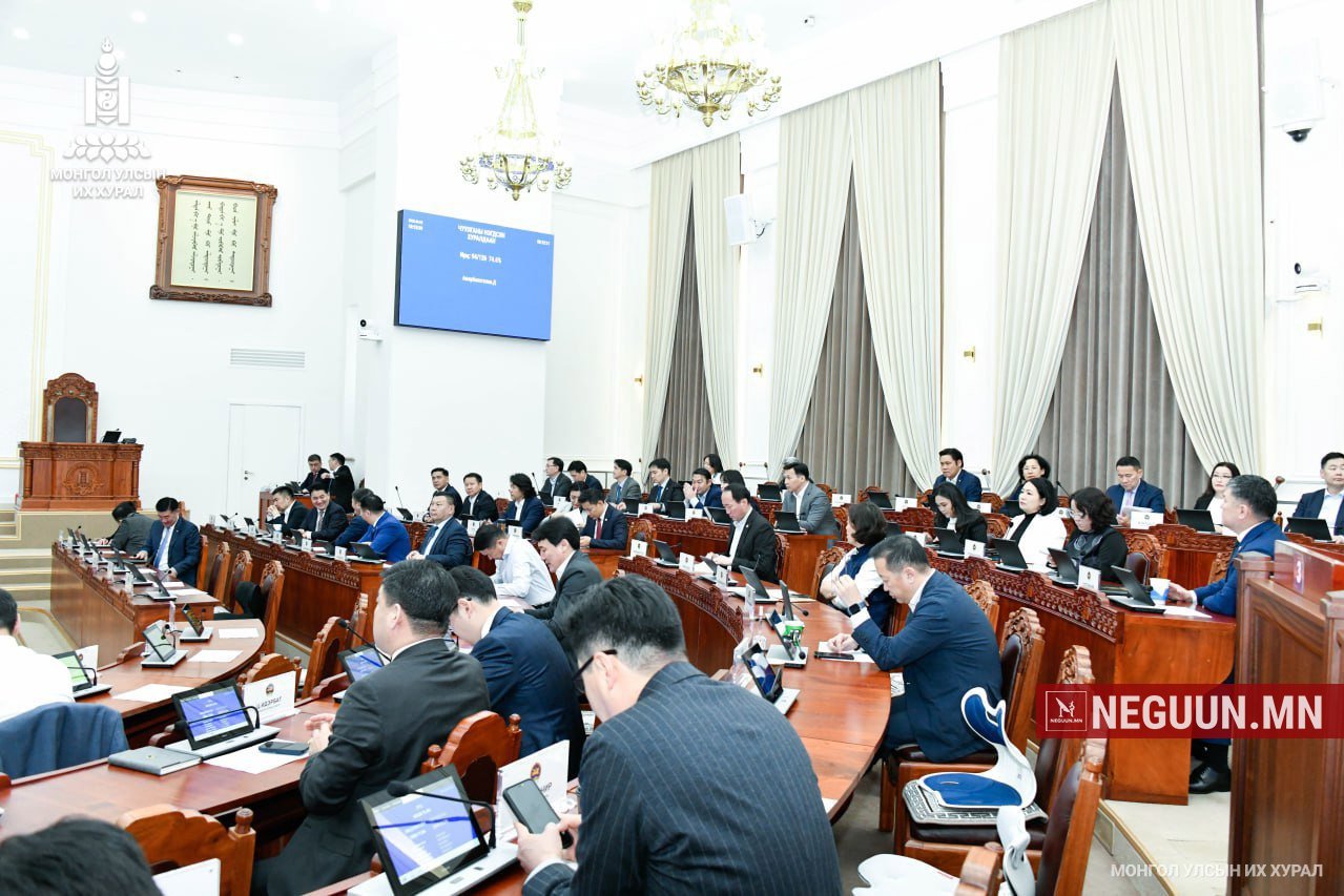 Улсын Их Хурлын 2025 оны хаврын ээлжит чуулганы өнөөдрийн /2025.05.26/ нэгдсэн хуралдаан 11 цаг 22 минутад, гишүүдийн 79.4 хувийн ирцтэй эхлэв. Хуралдааны эхэнд Засгийн газраас 2025 оны 05 дугаар сарын 09-ний өдөр өргөн мэдүүлсэн Хот, тосгоны эрх зүйн байдлын тухай хууль /Шинэчилсэн найруулга/-д өөрчлөлт оруулах тухай хуулийн төсөл болон хамт өргөн мэдүүлсэн хууль, тогтоолын төслүүдийн анхны хэлэлцүүлгийг үргэлжлүүлэв. Улсын Их Хурлын чуулганы 2025 оны 05 дугаар сарын 23-ны өдрийн нэгдсэн хуралдаанаар хууль, тогтоолын төслүүдийн анхны хэлэлцүүлгийг явуулж, Байнгын хорооны санал, дүгнэлттэй холбогдуулан гишүүд асуулт асууж, санал хэлсэн. Иймд энэ өдрийн хуралдаанаар хууль, тогтоолын төслүүдийн анхны хэлэлцүүлгийг эцэслэн батлах үе шатруу шилжүүлэх Байнгын хорооны горимын саналаар санал хураалтыг явуулав. Уг саналыг хуралдаанд оролцсон гишүүдийн 82.4 хувь нь дэмжсэн тул үргэлжлүүлэн Монгол Улсын Их Хурлын чуулганы хуралдааны дэгийн тухай хуулийн 44 дүгээр зүйлийн 44.2-т “Нэгдсэн хуралдаанд хуулийн төслийг эцэслэн батлах санал хураалт явуулах бөгөөд Улсын Их Хурлын нийт гишүүний олонх дэмжсэн бол эцэслэн баталсанд тооцно.” гэсний дагуу санал хураав. Ингээд Хот, тосгоны эрх зүйн байдлын тухай хуульд өөрчлөлт оруулах тухай хуулийн төсөл болон хамт өргөн мэдүүлсэн хууль, тогтоолын төсөл тус бүрээр эцэслэн батлах санал хураалтыг явуулахад, Улсын Их Хурлын нийт гишүүдийн олонх дэмжлээ. Дараа нь Сонгуулийн ерөнхий хорооны гишүүнээс чөлөөлөх тухай асуудлыг хэлэлцсэн. Монгол Улсын Их Хурлын чуулганы хуралдааны дэгийн тухай хуулийн 111 дүгээр зүйлийн 111.2-т “Нэгдсэн хуралдаан эрх бүхий албан тушаалтны санал, холбогдох Байнгын хорооны санал, дүгнэлтийг сонсож нууц санал хураалт явуулж хуралдаанд оролцсон гишүүдийн олонх томилох, чөлөөлөх саналыг дэмжсэн бол энэ тухай тогтоол баталсанд тооцно.” гэсний дагуу санал хураалтыг нууцаар явуулсан. Д.Дэлгэрсайханыг өөрийнх нь гаргасан хүсэлтийн дагуу Сонгуулийн ерөнхий хорооны гишүүнээс чөлөөлөх саналыг дэмжье гэдэг саналын томьёоллоор санал хураахад, хуралдаанд оролцсон гишүүдийн олонх дэмжив. Хуралдаан Засгийн газраас 2025 оны 03 дугаар сарын 26-ны өдөр өргөн мэдүүлсэн, Зөвшөөрлийн тухай хуульд нэмэлт, өөрчлөлт оруулах тухай хуулийн төсөл болон хамт өргөн мэдүүлсэн хуулийн төслүүдийн анхны хэлэлцүүлгээр үргэлжиллээ. Улсын Их Хурлын чуулганы 2025 оны 05 дугаар сарын 23-ны өдрийн хуралдаанаар хуулийн төслүүдийн анхны хэлэлцүүлгийг явуулж, Байнгын хорооны санал, дүгнэлттэй холбогдуулан гишүүд асуулт асууж, байр сууриа илэрхийлсэн. Өнөөдрийн нэгдсэн хуралдаанаар хуулийн төслүүдийн талаарх зарчмын зөрүүтэй таван саналаар санал хураалт явуулахад, хуралдаанд оролцсон гишүүдийн олонх дэмжлээ. Тухайлбал, Эрүүгийн хуульд нэмэлт оруулах тухай хуулийн төслийн 1 дүгээр зүйлд төлбөрт таавар, бооцоот тоглоомын үйл ажиллагаа эрхлэхтэй холбоотойгоор “Олон нийтийн газар, эсхүл мэдээллийн технологи ашиглан ашиг олох зорилгоор төлбөрт таавар, эсхүл бооцоот тоглоом зохион байгуулсан бол хоёр мянга долоон зуун нэгжээс арван дөрвөн мянган нэгжтэй тэнцэх хэмжээний төгрөгөөр торгох, эсхүл хоёр зуун дөчин цагаас долоон зуун хорин цаг хүртэл хугацаагаар нийтэд тустай ажил хийлгэх, эсхүл зургаан сараас гурван жил хүртэл хугацаагаар зорчих эрхийг хязгаарлах, эсхүл зургаан сараас гурван жил хүртэл хугацаагаар хорих 