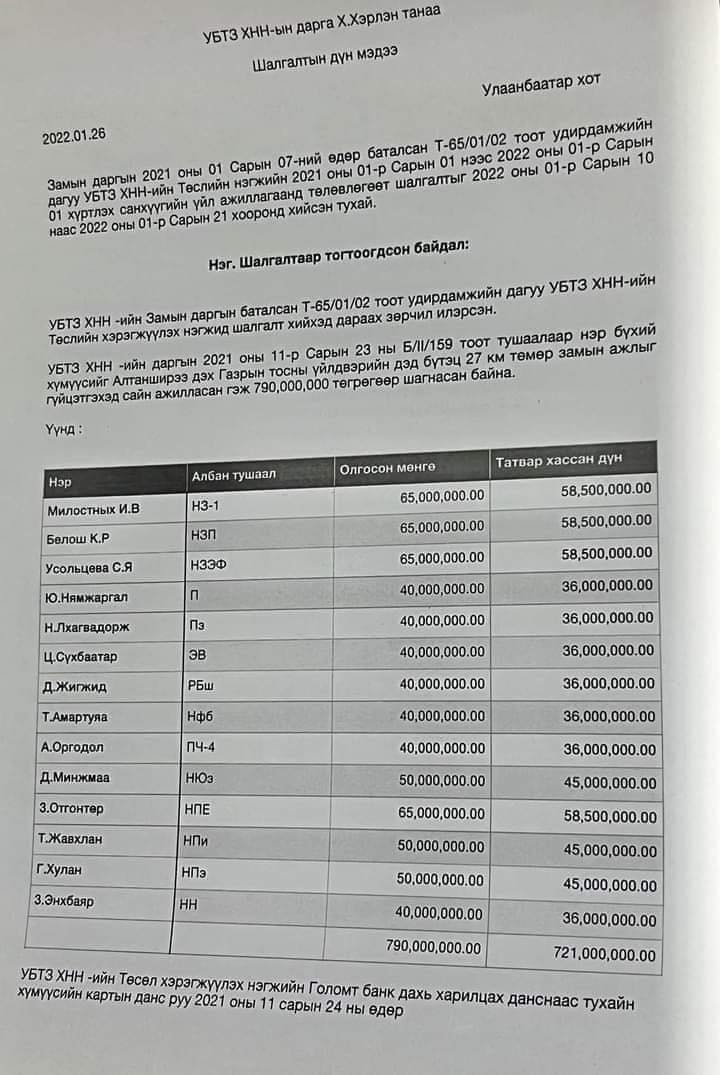 Тодруулбал: УБТЗ-ын нэр бүхий 15 дарга өөрсдийгөө 790 сая төгрөгөөр шагнасан зөрчил илэрсэн байна.