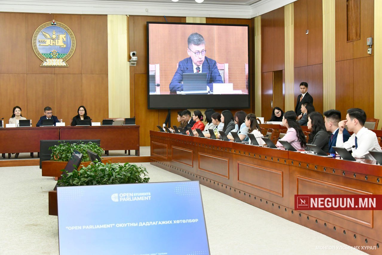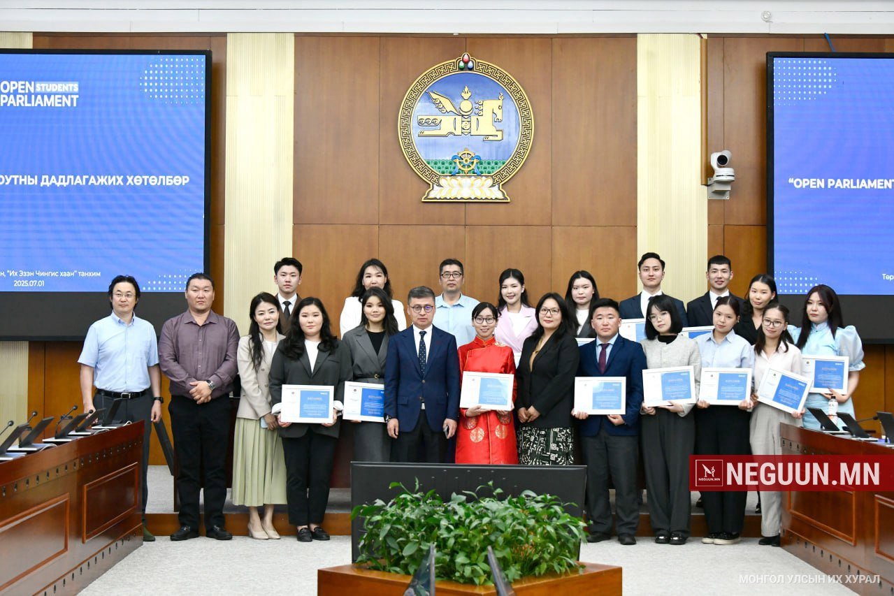 Монгол Улсын Их Хурлын үйл ажиллагааны ил тод, нээлттэй байдлыг нэмэгдүүлэх, парламентад итгэх иргэдийн итгэлийг бэхжүүлэхоюутан залууст парламентын талаар сурталчлан таниулах, тэднийг сэдэлжүүлэх, энэ төрлийн мэдлэг, мэдээллийг нэмэгдүүлж, оролцоог дээшлүүлэх зорилготой “Нээлттэй парламент” дадлагажих хөтөлбөр өнөөдөр (2025.07.01) хаалтаа хийлээ.