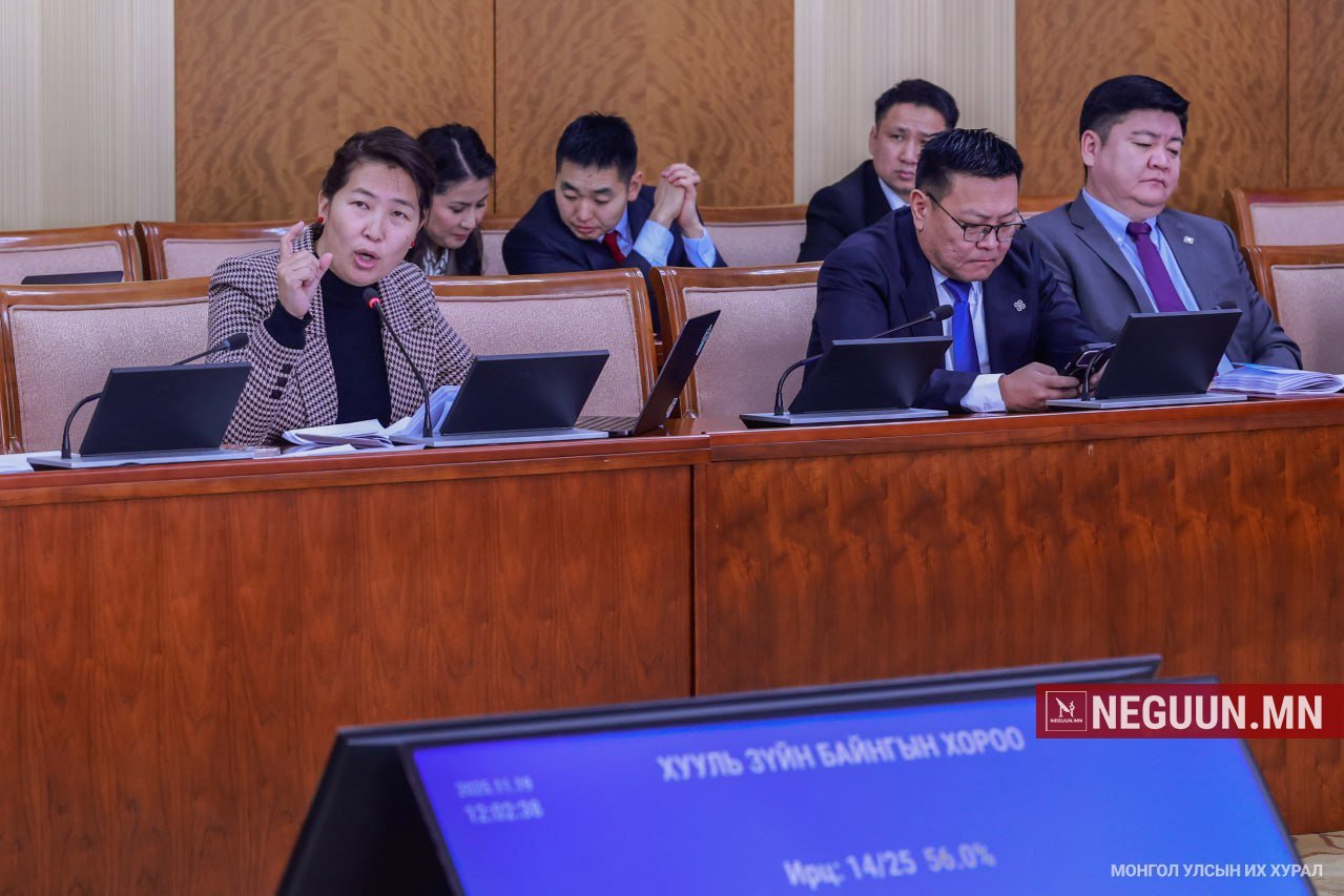 Улсын Их Хурлын Хууль зүйн байнгын хорооны өнөөдрийн (2025.11.19) хуралдаан 10 цаг 44 минутад гишүүдийн 52 хувийн ирцтэйгээр эхэлж, хоёр асуудал хэлэлцэн шийдвэрлэлээ.