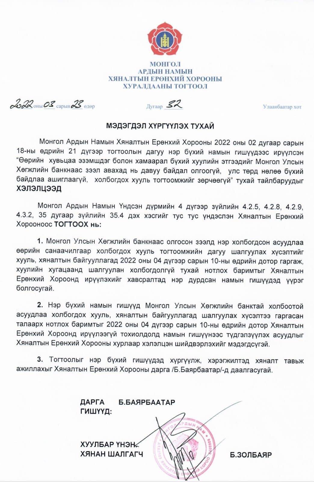 2022.03.23-ны өдөр Монгол Ардын Намын Хяналтын ерөнхий хороо Хөгжлийн банкны асуудлаар дахин хуралдаж, ирүүлсэн тайлбар нэг бүрийг авч хэлэлцээд, Намын дүрмийн 4 дүгээр зүйлийн 4.2.5, 4.2.8, 4.2.9, 4.3.2, 35 дугаар зүйлийн 35.4 дэх хэсгийг тус тус үндэслэн, “Мэдэгдэл хүргүүлэх тухай” 32 тоот тогтоол гаргалаа.