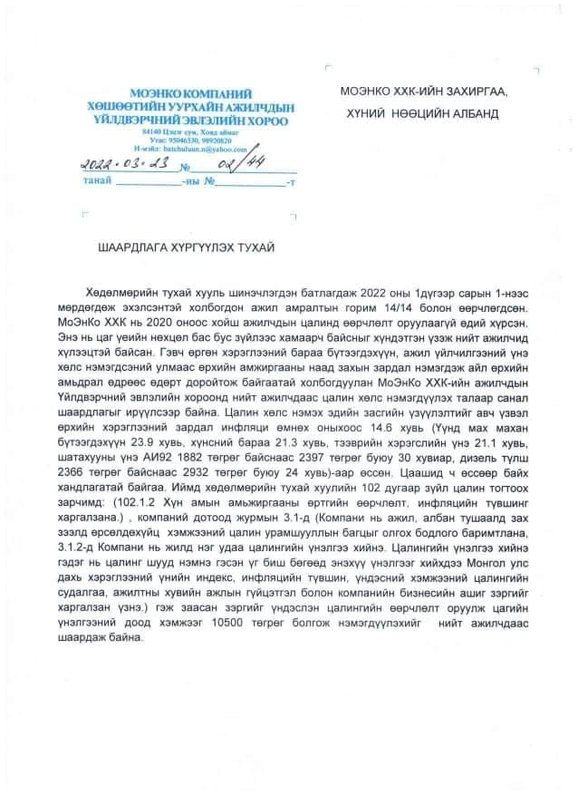 Уурхайн ажилчид "МОНЭНКО" компанийн удирдлагуудад хүргүүлсэн хүсэлтэндээ "Сүүлийн хоёр жилийн хугацаанд ажилчдын цалинд өөрчлөлт оролгүй өдийг хүрлээ. Өрхийн хэрэглээний зардал өмнөх эоноос 14,6 хувиар өссөн зэрэг үзүүлэлтийг авч үзнэ үү" хэмээн тухайн мэдэгдэлдээ бичсэн байна.