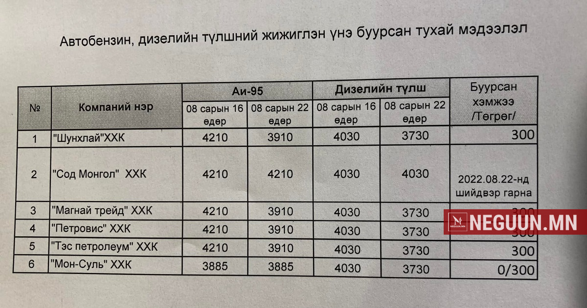 ДИЗЕЛЬ ТҮЛШ БОЛОН АИ-95 ШАТАХУУНЫ ҮНЭ ЛИТР ТУТАМДАА 300 ТӨГРӨГӨӨР БУУРЛАА