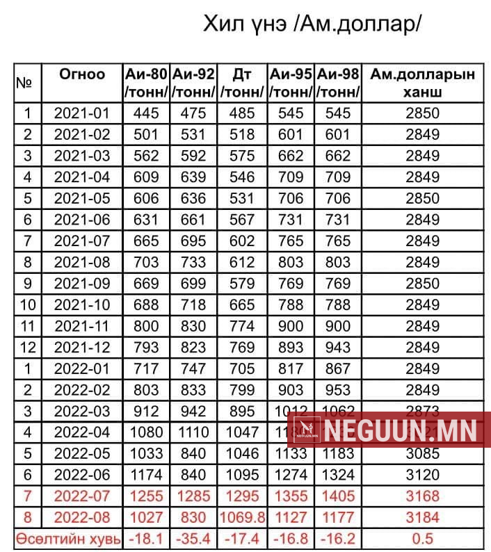 АИ-92 шатахууны үнэ он дуустал 2390 төгрөг хэвээр байна. Есдүгээр сард дизель түлшний үнэ дахин буурах болов уу гэсэн хүлээлттэй байгаа. Ургац хураалтын цаг болж энэ үед дизель түлш гол хэрэглээ болдог. ХХААХҮЯ-наас ургац хураалтын үед 10000 тонн дизель түлш шаардагдана гэсэн тооцоолол ирүүлсэн" хэмээв.