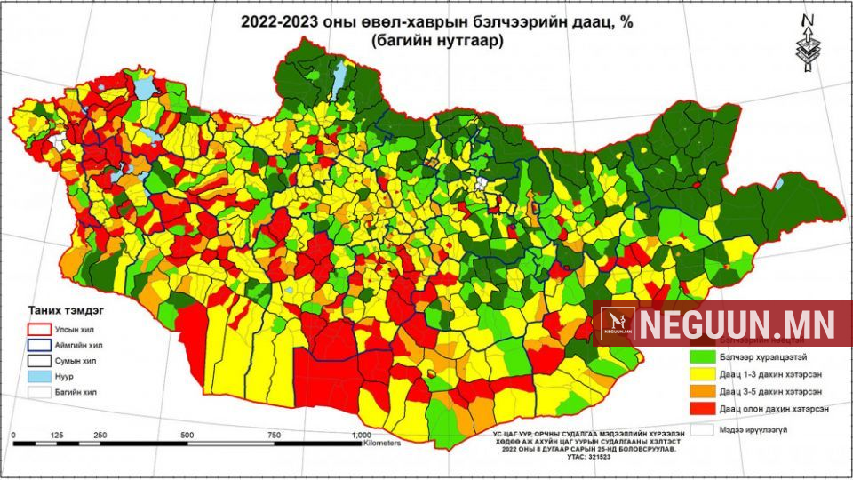 Засгийн газрын 286 дугаар тогтоолын дагуу Ус цаг уур, орчны судалгаа, мэдээллийн хүрээлэнд 2022-2023 оны өвөл, хаврын бэлчээрийн даацыг баг бүрийн бэлчээрийн ургац, малын тоо, бэлчээрийн талбайн хэмжээ, бэлчээр ашиглах хугацаа зэрэг мэдээлэлд үндэслэн багийн нутгаар тооцоолжээ.
