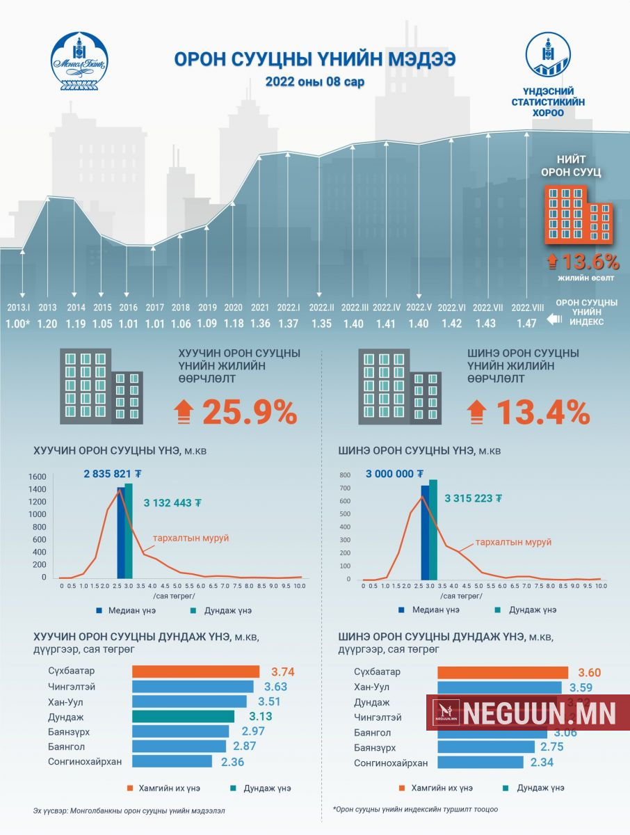 Наймдугаар сард шинэ орон сууцны 1 метр квадрат талбайн дундаж үнэ 3.32 сая төгрөг болж, Сүхбаатар дүүрэгт хамгийн их буюу 3.6 сая төгрөг байна. Шинэ орон сууцны үнийн жилийн өөрчлөлтийг харвал, 13.4 хувиар өсжээ.