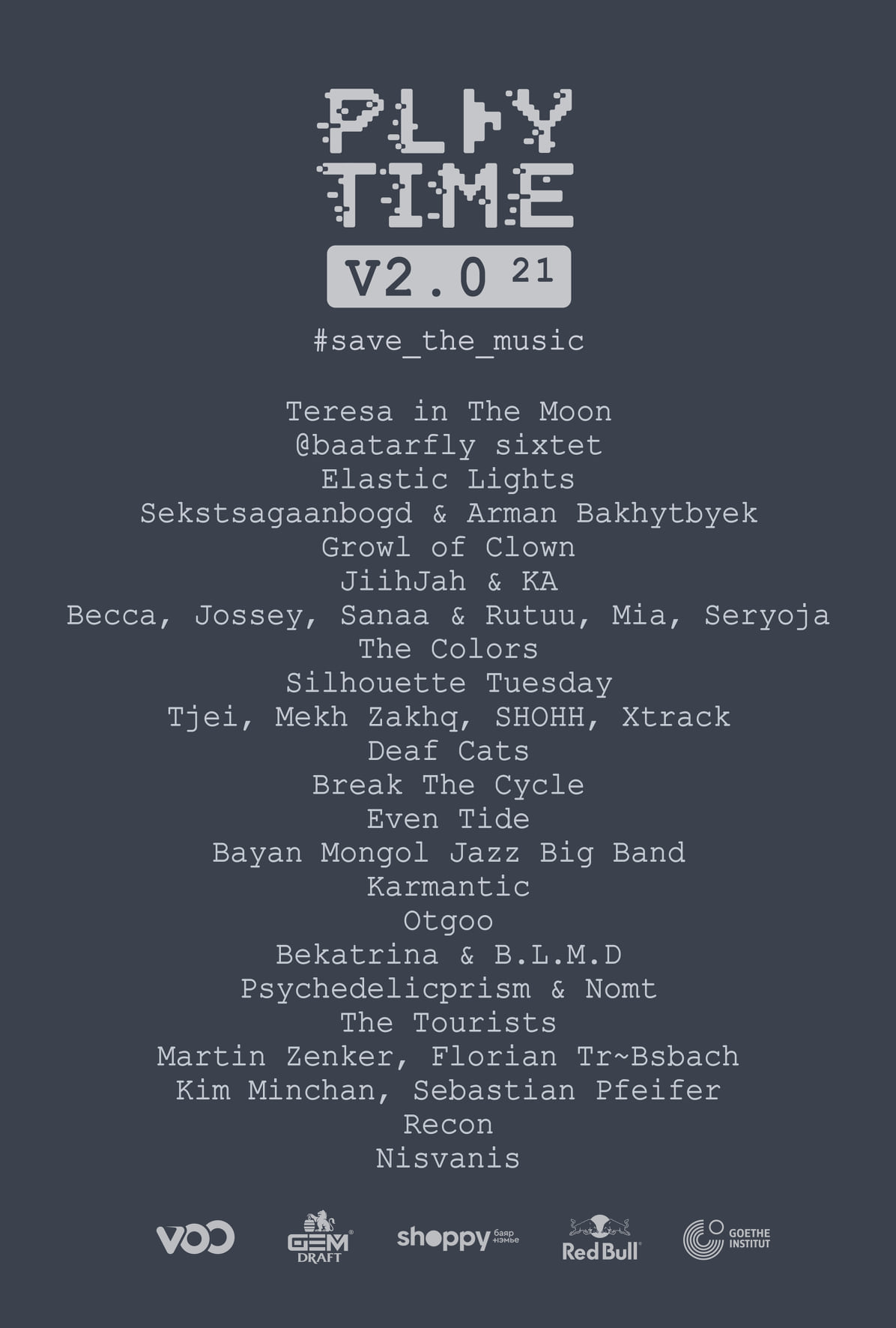 Амьд хөгжимд дурлагчдын хүсэн хүлээдэг “Playtime” хөгжмийн фестивал энэ жил наймдугаар сарын 16-19-нд зохион байгуулах байсан боловч цар тахалтай энэ цаг үед дахин нэг жил хойшлуулахаар болсон.