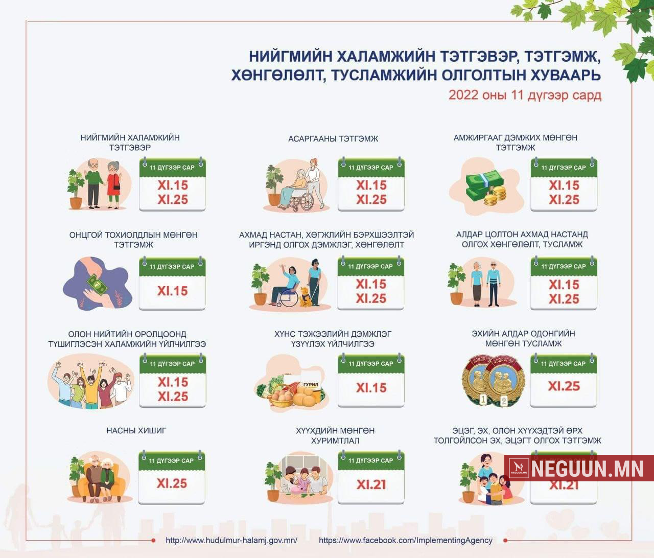 Нийгмийн халамжийн тэтгэвэр, тэтгэмж, хөнгөлөлт, тусламж олгох дөрөвдүгээр сарын хуваарь гарчээ. Хуваарийн дагуу эх, эцэг, олон хүүхэдтэй өрх толгойлсон эх, эцэгт олгох тэтгэмж болон хүүхдийн мөнгийг дөрөвдүгээр сарын 20-нд олгох бол нийгмийн халамжийн тэтгэврийг дөрөвдүгээр сарын 14, 26-нд, ахмад настан, хөгжлийн бэрхшээлтэй иргэнд олгох хөнгөлөлт, тусламж, насны хишгийг дөрөвдүгээр сарын 26-нд олгох юм байна.