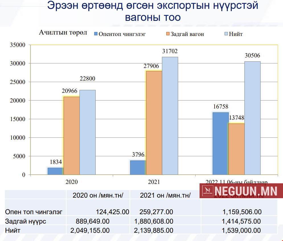 Арваннэгдүгээр сарын 6-ны өдрийн байдлаар УБТЗ Эрээн өртөөнд нийт 3317 галт тэрэг өгснөөс 636 нь экспортын нүүрстэй галт тэрэг байв. Өөрөөр хэлбэл, опен топ, задгай вагон ашиглан Эрээн өртөөнд нийт 30506 вагоноор 1 сая 539 мянган тонн нүүрс экспортод өгчээ.