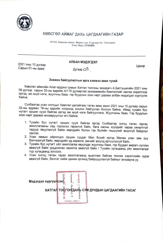 Хөвсгөл аймгийн Хатгал тосгоныхоныг “Сүхбаатар” онгоцыг татан гаргах ажиллагаа явагдах үеэр гэрээсээ гарахгүй байхыг үүрэгджээ.Онгоц татан авах ажиллагаа аравдугаар сарын 18-ныг хүртэл үргэлжлэх тул иргэдийн ийнхүү энэ 10-р сарын 01-нээс 18-ныг дуустал гэрээсээ бүү гар хэмээжээ. Үүний зэрэгцээ усан замын ойролцоох иргэдийг малаа ус руу бэлчээхгүй байх, татах ажиллагааны үеийн техник хэрэгслийн зургийг авах, бичлэг хийж цахимд нийтлэхийг хатуу хоригложээ. Ингэж л өнө эрт живсэн хөлөг онгоцыг татан гаргахын тулд сүржигнэхийн зэрэгцээ ихэд нууцалжээ.