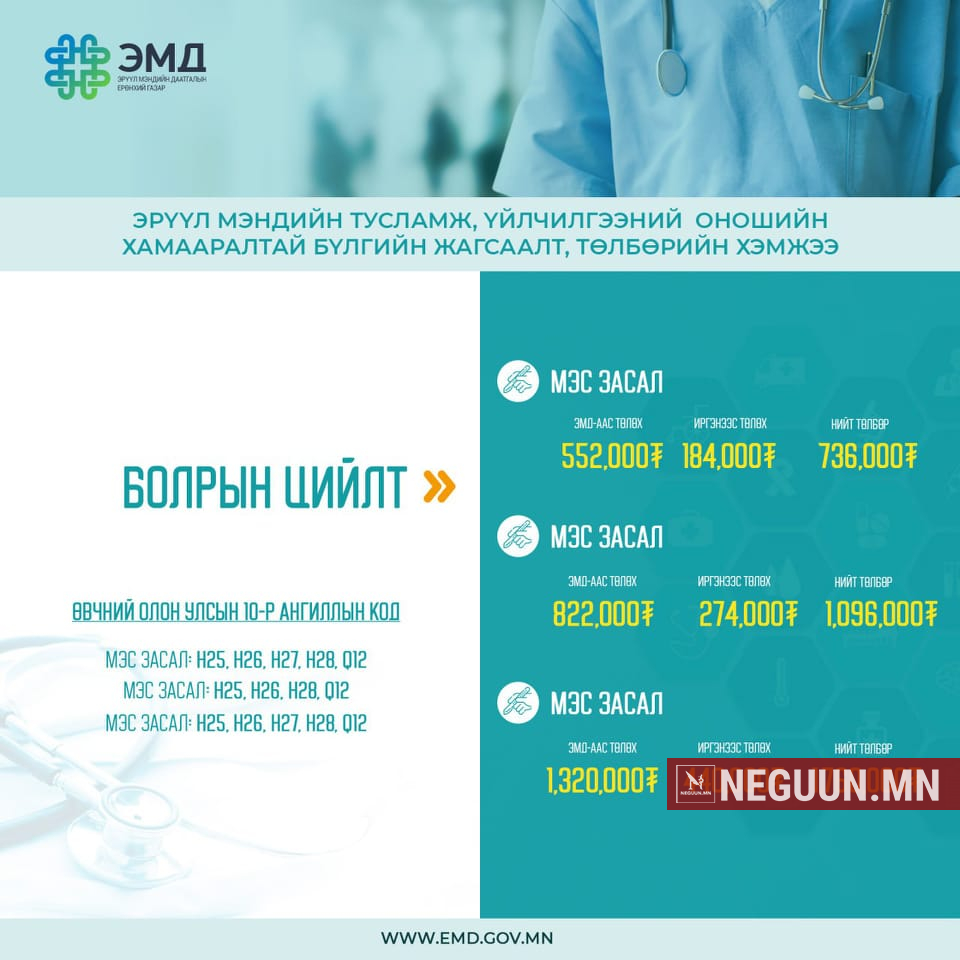 Эрүүл мэндийн даатгалын үндэсний зөвлөлийн 2022 оны нэгдүгээр тогтоолоор тархины цус харвалтын эмийн эмчилгээ 770 мянган төгрөгөөс 2.3 сая төгрөг, мэс заслын тусламж, үйлчилгээ 1.2-48.9 сая төгрөг бөгөөд Эрүүл мэндийн даатгалын сангаас 100% санхүүжүүлэхийг мэдээлсэн.Оны эхний арван сарын байдлаар энэхүү тусламж, үйлчилгээний 9,868 тохиолдол бүртгэгдэж, Эрүүл мэндийн даатгалын сангаас 10.3 тэрбум төгрөгийн санхүүжилт олгожээ. 2022 оны есдүгээр сард эрүүл мэндийн тусламж, үйлчилгээ худалдан авах гэрээ байгуулсан төрийн өмчийн эрүүл мэндийн байгууллагууд: № Эрүүл мэндийн байгууллагын нэр Үйл ажиллагааны чиглэл Хаяг байршил Утасны дугаар I.ХЭВТҮҮЛЭН ЭМЧЛЭХ ТУСЛАМЖ, ҮЙЛЧИЛГЭЭ 1.1.ХЭВТҮҮЛЭН ЭМЧЛЭХ ТУСЛАМЖ, ҮЙЛЧИЛГЭЭ-УЛААНБААТАР 1 Арьсны өвчин судлалын үндэсний төв Төрөлжсөн мэргэшлийн тусламж үйлчилгээ Сүхбаатар дүүрэг, 11-р хороо Цагдаагийн гудамж-78 70135036 2 АШУҮИС-ийн Төв Эмнэлэг (Сургалын нэгдсэн эмнэлэг) Нэгдсэн эмнэлэг СБД-1-р хороо, 70120091 3 АШУҮИС-ийн Монгол Япон сургалтын эмнэлэг Нэгдсэн эмнэлэг Улаанбаатар хот, Баянзүрх дүүрэг, 12 дугаар хороо, Жанжны гудамж, Ботаникийн цэцэрлэгт хүрээлэн 70153098 77002528 77002529 4 Багахангай дүүргийн эрүүл мэндийн төв Дүүргийн хүн амд эмнэлгийн тусламж үйлчилгээ үзүүлэх Багахангай дүүрэг, 1-р хороо 70491026 5 Багануур дүүргийн эрүүл мэндийн төв Дүүргийн хүн амд эмнэлгийн тусламж үйлчилгээ үзүүлэх Багануур дүүрэг, 1-р хороо, Нацагдоржийн гудамж 70210238 70212905 6 Баянгол дүүргийн эрүүл мэндийн төв Дүүргийн хүн амд эмнэлгийн тусламж үйлчилгээ үзүүлэх Баянгол дүүрэг, 17-р хороо, Жалханз хутагт Дамдинбазарын гудамж 11361302 11362530 99036071 7 Гэмтэл согог судлалын үндэсний төв Төрөлжсөн мэргэшлийн тусламж үйлчилгээ Баянгол дүүрэг, 7-р хороо, Ард Аюушийн өргөн чөлөө 70180136 8 Налайх дүүргийн эрүүл мэндийн төв Дүүргийн хүн амд эмнэлгийн тусламж үйлчилгээ үзүүлэх Налайх дүүрэг, 2-р хороо, Дамдины гудамж 70233158 70232665 9 Амгалан амаржих газар Төрөлжсөн мэргэшлийн тусламж үйлчилгээ Баянзүрх дүүрэг, 13-р хороо, Энхтайваны өргөн чөлөө, ЗДТГ-ын зүүн урд 70164401 77110356 10 Өргөө амаржих газар Төрөлжсөн мэргэшлийн тусламж үйлчилгээ Сүхбаатар дүүрэг, 1-р хороо, Энхтайвны өргөн чөлөө 77000101 11 Хүрээ амаржих газар Төрөлжсөн мэргэшлийн тусламж үйлчилгээ Сүхбаатар дүүрэг, 5-р хороо, Сайн ноён хан Намнансүрэнгийн гудамж 3 92187000 92187003 12 Нийслэлийн наркологийн эмнэлэг Төрөлжсөн мэргэшлийн тусламж үйлчилгээ Баянгол дүүрэг, 20-р хороо, Толгойтын 10н буудал 70173985 13 Улсын нэгдүгээр төв эмнэлэг Улсын хэмжээнд лавлагаа шатлалын тусламж, үйлчилгээ Сүхбаатар дүүрэг, 1-р хороо, Энхтайвны өргөн чөлөө, С.Зоригийн гудамж-2 80183000 14 Улсын хоёрдугаар төв эмнэлэг Улсын хэмжээнд лавлагаа шатлалын тусламж, үйлчилгээ Баянзүрх дүүрэг, 3-р хороо, Энхтайвны өргөн чөлөө 70150234 70150235 15 Улсын гуравдугаар төв эмнэлэг Улсын хэмжээнд лавлагаа шатлалын тусламж, үйлчилгээ Баянгол дүүрэг, 6-р хороо, Ард Аюушийн өргөн чөлөө 77046666 77000369 16 УАУТХүрээлэн Уламжлалт болон орчин цагийн анагаах ухааны ТҮ Хан-Уул дүүрэг, 1-р хороо, Чингисийн өргөн чөлөө 11343013 11342150 17 УАУхааны элэг судлалын клиник төв Уламжлалт анагаах ухааны тусламж үйлчилгээ Сонгинохайрхан дүүрэг, 15-р хороо, 1-р хороолол, 21-р байр 70181044 70181176 18 Сонгинохайрхан дүүргийн Эрүүл мэндийн төв Дүүргийн хүн амд эмнэлгийн тусламж үйлчилгээ үзүүлэх Сонгинохайрхан дүүрэг, 13-р хороо, 1-р хороолол, Залуусын гудамж 79976000 19 Сонгинохайрхан нэгдсэн эмнэлэг Дүүргийн хүн амд эмнэлгийн ту