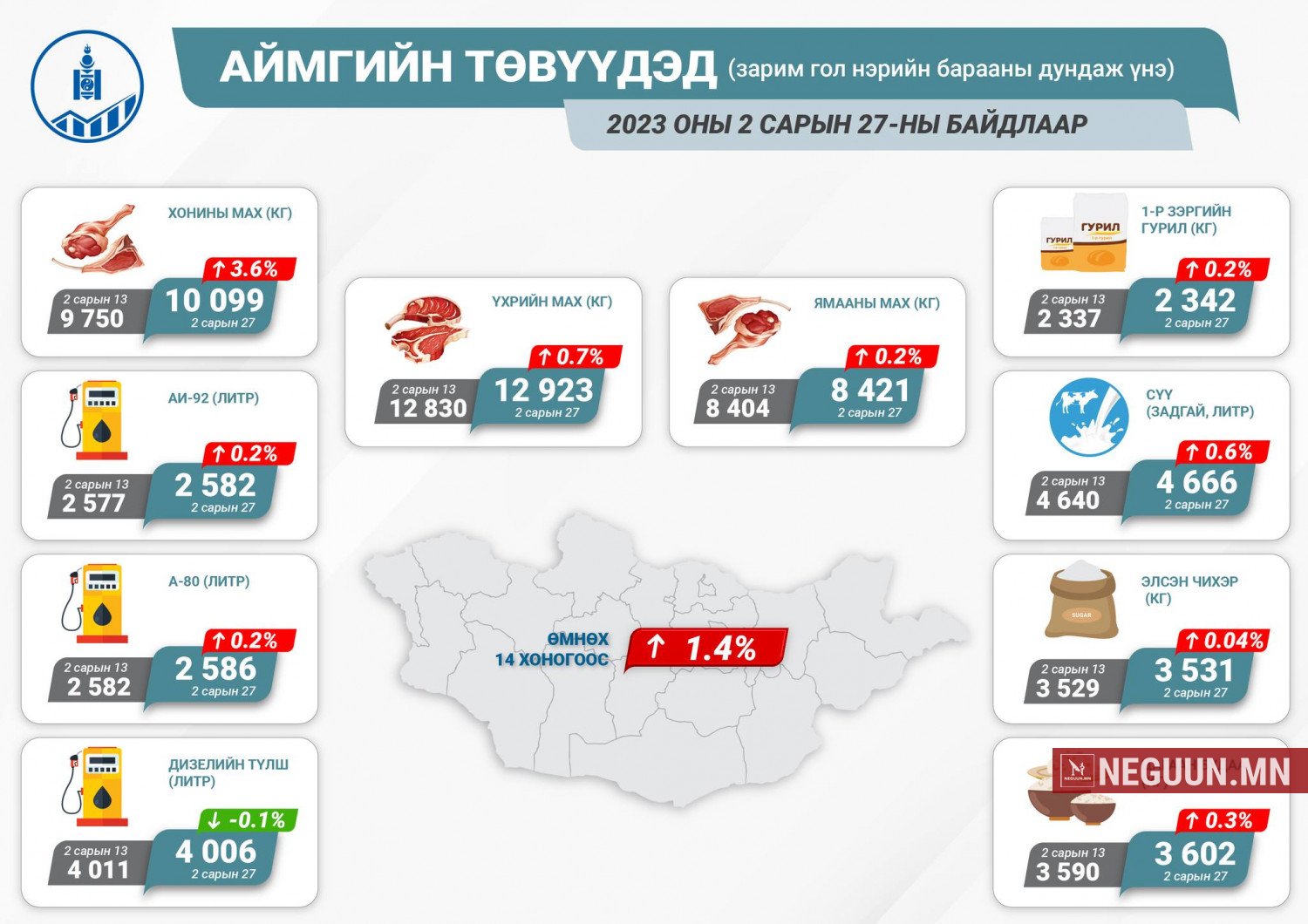 Харин аймгийн төвүүдэд зарим гол нэрийн барааны дундаж үнэ 1.4 хувиар өсжээ. тухайлбал аи-92 бензиний үнэ 2577 төгрөгөөс 2582 төгрөг болж 0.2 хувиар үнэ өсжээ. мөн хонь, ямаа, үхрийн мах, гурил, сүү, элсэн чихэр, цагаан будааны үнэ өссөн байна.
