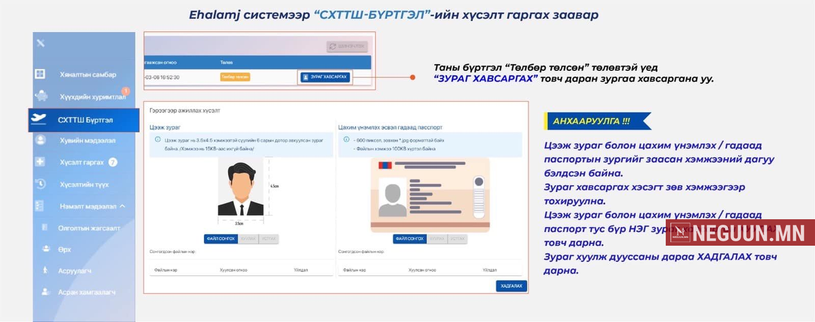 Бүртгүүлэх бичиг баримт нь /гадаад паспорт эсвэл иргэний цахим үнэмлэх/ болон цагаан дэвсгэр дээр бараан хувцастай эгц урдаас харсан (хэмжээ 3.5х4.5см) 1 хувь цээж зургийг урьдчилан зурган файлаар бэлтгэн заасан хэмжээг бүрэн багтааж цахимаар оруулна. /Сүүлийн 3 сарын дотор авхуулсан байх, селфи зураг оруулж болохгүй./