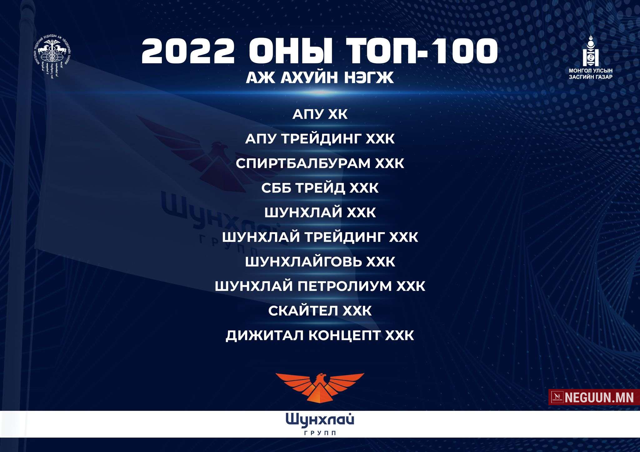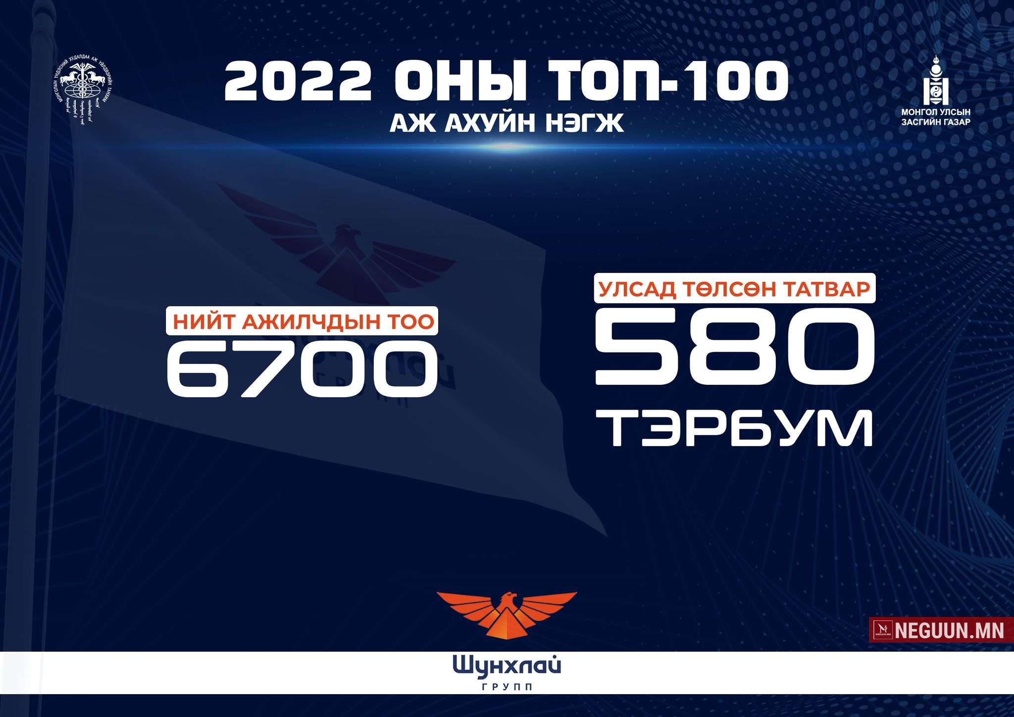 Монгол Улсын Засгийн газар, Монголын үндэсний худалдаа аж үйлдвэрийн танхим хамтран жил бүр нийгэм, эдийн засагт жинтэй хувь нэмэр оруулсан “Топ 100” аж ахуйн нэгжийг /ААН/  шалгаруулдаг уламжлалтай. Уг уламжлалын дагуу өнөөдөр /2023.05.18/ "Топ-100" ААН-ийг өнөөдөр  танилцуулав.