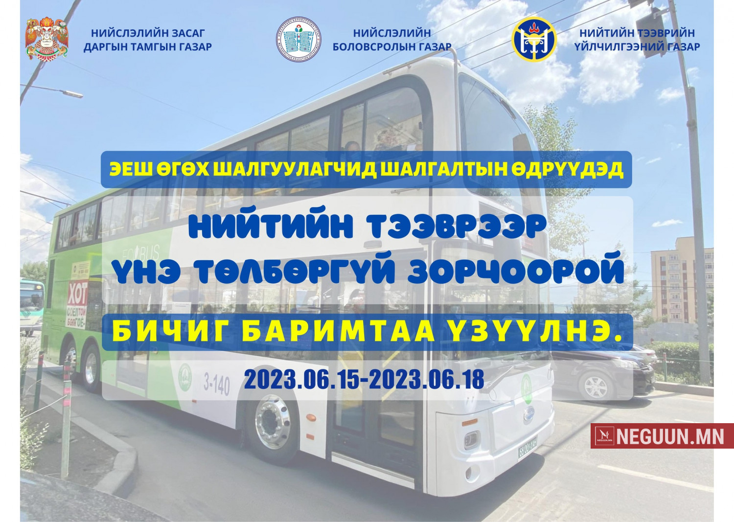 Тулгар төрийн 2230, 2231, Их Монгол Улсын 815, 816 жил, Ардын хувьсгалын 100, 101 жилийн ой, Үндэсний их баяр наадмын өдрүүдэд нийтийн тээврийн үйлчилгээнд үндсэн /хотын доторх болон хот орчмын/ 107 чиглэлд их, дунд багтаамжийн 674, зуслангийн гурван чиглэлд тав, шөнийн тээврийн үйлчилгээний гурван чиглэлд зургаа, нийт 685 автобус үйлчилгээнд ажиллуулахаар Нийслэлийн Нийтийн тээврийн газраас төлөвлөөд байна. БОГИНО ЭРГЭЛТИЙН АВТОБУС НААДАМЧДАД ҮНЭ ТӨЛБӨРГҮЙ Үндсэн чиглэлийн 685 автобус дээр нэмэлтээр зургаан чиглэлд 56 автобусыг наадамчдад зориулж явуулах юм. Эдгээрийн гурав нь богино эргэлтийн чиглэл байх бөгөөд богино эргэлтийн автобуснууд иргэдэд үнэ төлбөргүй үйлчилнэ. Тодруулбал, Дүнжингарав худалдааны төв-Төв цэнгэлдэх хүрээлэн, Вокзал-Төв цэнгэлдэх хүрээлэн, Хүй долоон худгийн Галт тэрэгний зогсоол буюу “Давааны зөрлөг”-өөс Морь барианы газар руу наадамчдад үнэ төлбөргүй үйлчилнэ. Зөвхөн богино эргэлтийн автобусанд иргэд үнэгүй зорчих юм. БОГИНО ЭРГЭЛТИЙН ЧИГЛЭЛҮҮДИЙН ТӨЛӨВЛӨЛТ / ҮНЭГҮЙ / ХҮЙ ДОЛООН ХУДАГ РУУ ЗӨВХӨН КАРТААР ҮЙЛЧИЛНЭ Хүй долоон худаг руу Төв цэнгэлдэх хүрээлэн, Боловсролын их сургууль, Таван шараас нийтийн тээврийн автобусаар үйлчлэх юм. Үйлчилгээний хөлс 1500 төгрөг бөгөөд төлбөрийг зөвхөн картаар төлнө гэдгийг мэргэжилтнүүд анхаарууллаа. Долдугаар сарын 11, 12-ны өдрүүдэд Төв цэнгэлдэх хүрээлэн буюу Гандийн гудамжны автобусны зогсоолоос 10 автобус долоон минут тутамд, долдугаар сарын 13-ны өдөр хотын төв “МУБИС”-ийн баруун тал буюу “Улаанбаатар зочид буудал”-ын автобусны зогсоолоос 06:00 цагаас их багтаамжийн таван автобус 10 минут тутамд “Хүй долоон худаг” руу 1500 төгрөгийн тарифаар үйлчилнэ. Мөн долдугаар сарын 11-15-нд Хүй долоон худгийн шөнийн арга хэмжээнд зориулж 18:00-03:00 цагийн хооронд зургаан автобус “Таван шар-Хүй долоон худаг” чиглэлд үйлчилнэ. ХҮЙ 7 ХУДАГ ЧИГЛЭЛД ХҮРЭХ ЧИГЛЭЛҮҮДИЙН МЭДЭЭЛЭЛ /1500 ТӨГРӨГ / ГЭРЭЭТ БАЙГУУЛЛАГЫН ТАКСИ ЗАМ ХААСАН ЧИГЛЭЛД Ч ЗОРЧИНО Төв цэнгэлдэх хүрээлэн орчим болон Таван шарын дөрвөн түр зогсоолоос Нийслэлийн Нийтийн тээврийн газартай гэрээтэй ажилладаг найман аж ахуйн нэгжийн 383 такси иргэдэд үйлчилнэ. Албан ёсны гэрээт байгууллагын таксинууд зам хаасан чиглэлд үйлчлэх бөгөөд эрх авсан 180 такси байгаа аж. Такси үйлчилгээний зогсоолууд: Төв цэнгэлдэх хүрээлэнгийн урд тал: Нийслэлийн гудамж, “Хурд” хорооллын хойд зогсоол; Төв цэнгэлдэх хүрээлэнгийн хойд тал: Махатма Гандийн гудамж, “Ж” зогсоолын баруун талын зогсоол Төв цэнгэлдэх хүрээлэнгийн баруун тал: Чингисийн өргөн чөлөө, Наадам центрийн баруун талын зогсоол, Таван шарын хойд автобусны зогсоолын зүүн талаас албан ёсны гэрээ бүхий компанийн таксинууд үйлчилгээ үзүүлэх юм байна. Наадмын эхний хоёр өдөр Төв вокзалаас Давааны өртөө хүртэл галт тэрэг 2000 төгрөгийн тарифаар үйлчилнэ.