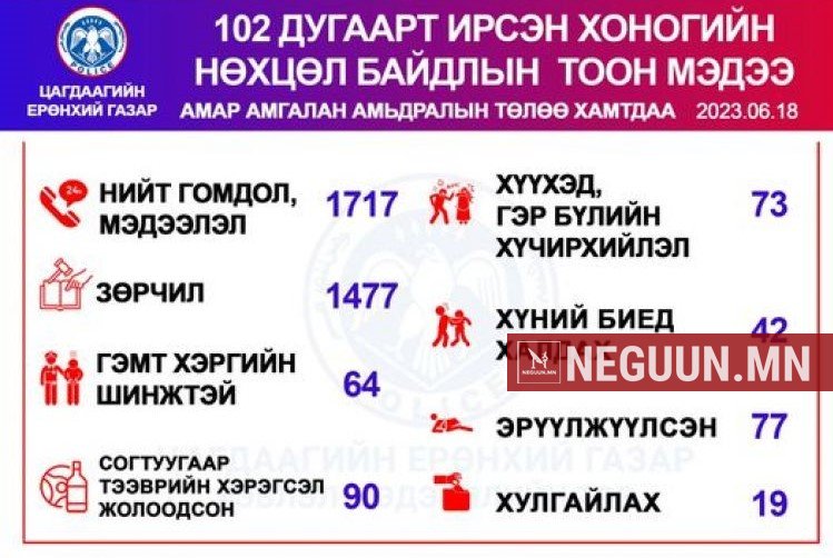 Согтуугаар тээврийн хэрэгсэл жолоодох зөрчил буурахгүй байгааг цагдаагийн байгууллагаас онцолж байна. Өнгөрсөн амралтын ганцхан өдөрт л согтуугаар тээврийн хэрэгсэл жолоодсон 90 зөрчил илэрсэн байна. Илэрсэн 90 зөрчил болохоос далдуур хэд хэчнээн согтуу жолооч явж байсныг мэдэх аргагүй юм. Жолооч та согтууруулах ундаа хэрэглэсэн бол жолооны ард суухгүй байхыг зөвлөж байна. Цагдаагийн байгууллагын 102 тусгай дугаарт 2023 оны 06 дугаар сарын 18-ны өдөр нийт 1717 дуудлага, мэдээлэл бүртгэгдсэнээс зөрчлийн шинжтэй 1477 гэмт хэргийн шинжтэй 64 дуудлага, мэдээлэл байна.