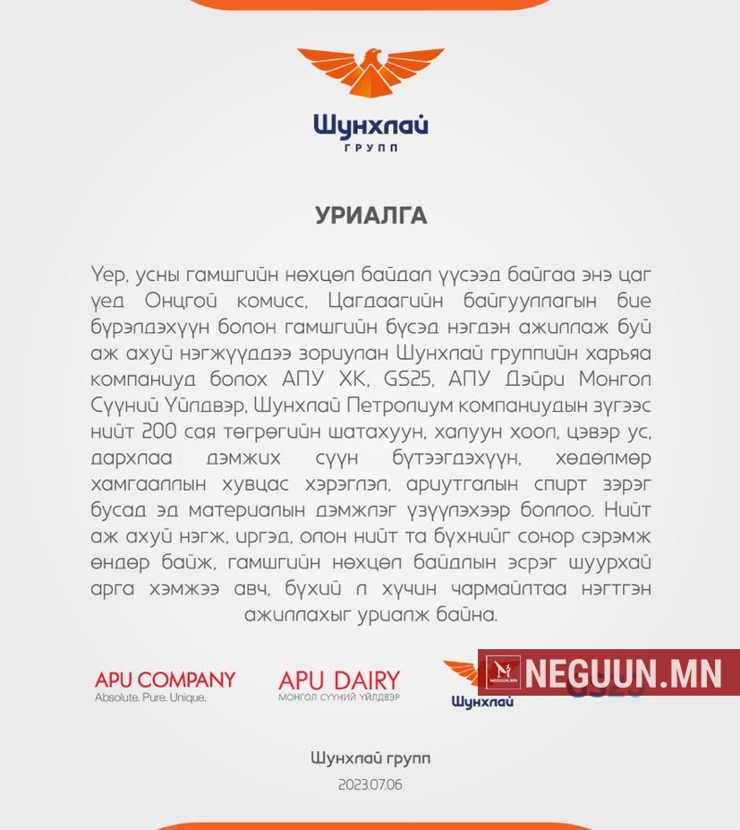 Үер, усны гамшгийн нөхцөл байдал үүсээд байгаа энэ цаг үед "Шунхлай Групп"-ийн харъяа компаниуд нэгдэж нийт 200 сая төгрөгийн дэмжлэг үзүүлэхээр боллоо. Нийт аж ахуй нэгж, иргэд, олон нийт та бүхнийг сонор сэрэмж өндөр байж, гамшгийн нөхцөл байдлын эсрэг шуурхай арга хэмжээ авч, бүхий л хүчин чармайлтаа нэгтгэн ажиллахыг уриалж байна.