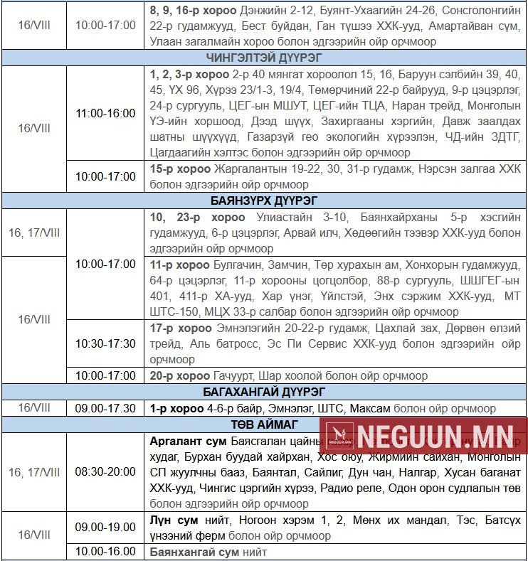Өнөөдөр буюу наймдугаар сарын 16-ны Лхагва гарагт хийх засварын хуваарийг танилцуулж байна. Хэрэглэгчид ээ, засвар хийх хугацаанд хэрэглээгээ түр зохицуулна уу.