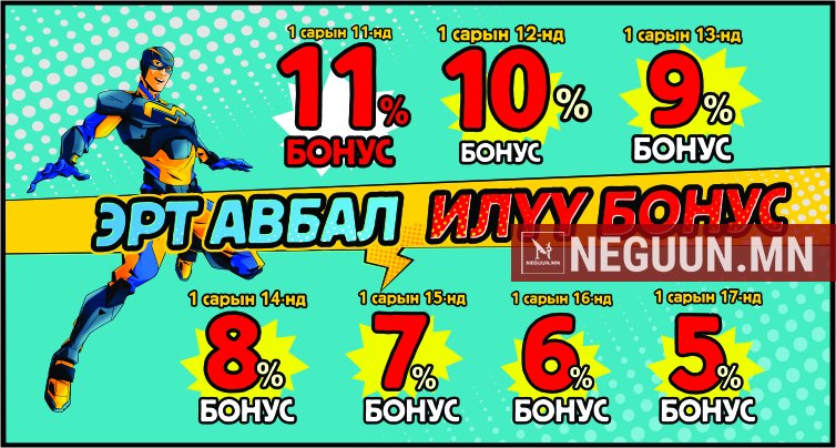 “МЕГА БОНУС-тай MEGA SALE ” BSB-д эхэллээ ! Хамгийн том электрон барааны дэлгүүр болох BSB -д бүх электрон бараа, компьютер, гар утас нууд 5-8%-ийн МЕГА БОНУС-тай боллоо. Та худалдан авалт бүртээ 5-8%-ийн МЕГА БОНУС цуглуулж, цуглуулсан МЕГА БОНУС-аа дараагийн худалдан авалтандаа 100% ашиглах боломжтой. Хэрвээ та зээлээр бараа авахыг хүсвэл BSB -гийн салбар дэлгүүрүүдэд урьдчилгаа төлбөргүй, хамгийн бага 1.8%-ийн хүүтэй лизингийг газар дээр нь 10-хан минутанд шуурхай олгож байна. “МЕГА БОНУС-тай MEGA SALE ” худалдаа нь 10 -р сарын 15-ныг дуустал явагдах тул та өөрт ойрхон BSB -гийн салбар дэлгүүрүүдээр зочилж хамгийн олон төрлийн гэр ахуйн электрон бараа, компьютер, гар утаснуудаас сонголтоо хийгээрэй. Нэмээд дуулгахад, Дархан, Эрдэнэт, Даланзадгад хотууд дахь BSB -гийн салбар дэлгүүрүүдэд ч бас энэхүү худалдаа мөн адил явагдаж байна. Электрон бараа үзэх : Компьютер үзэх: Гар утас үзэх: Салбар дэлгүүрүүдийн хаяг байршил харах: Харилцах утас: 7722-0272 “МЕГА БОНУС-тай MEGA SALE ” Зөвхөн BSB-д