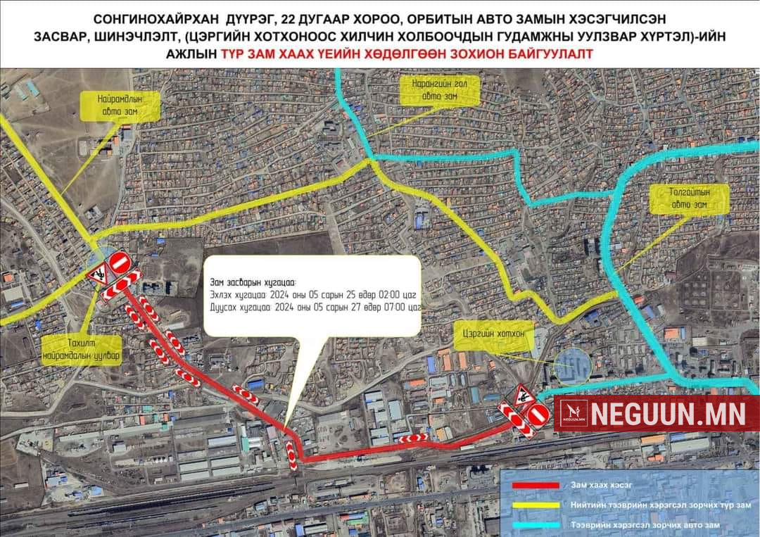 Сонгинохайрхан дүүргийн 22 дугаар хороо, Цэргийн хотхоноос Хилчин холбоочдын гудамжны уулзвар хүртэлх авто замыг тавдугаар сарын 24-ний өдрийн 23:00 цагаас тавдугаар сарын 27-ны өдрийн 07:00 цагийн хооронд хааж, шинэчилнэ.