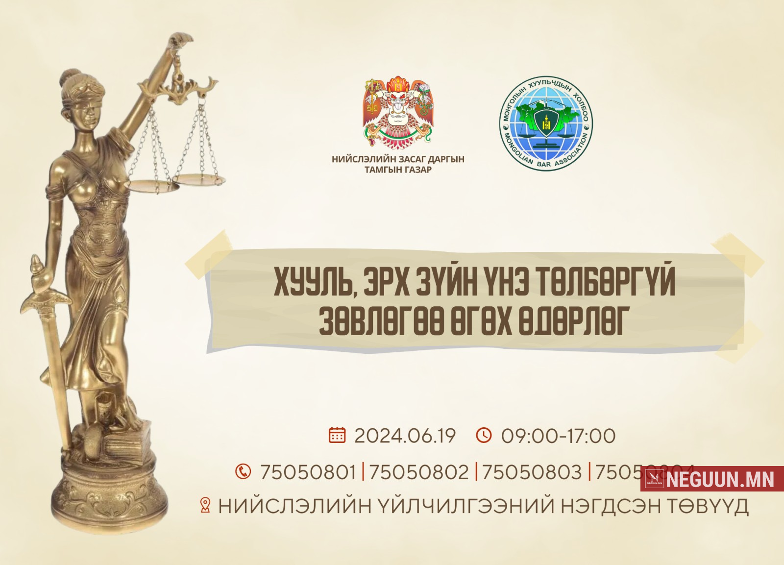 НЗДТГ-аас “Бүх нийтийн эрх зүйн боловсролыг дээшлүүлэх үндэсний хөтөлбөр” болон “Нийслэлийн иргэдийн хууль, эрх зүйн боловсролыг дээшлүүлэх” арга хэмжээний хүрээнд Монголын Хуульчдын холбоотой хамтран иргэдэд хууль, эрх зүйн үнэ төлбөргүй зөвлөгөө өгдөг. Энэ удаагийн өдөрлөгт "Онч нүүдэл" ХХН хамтран оролцож байна. Энэ сарын өдөрлөгийг маргааш буюу арваннэгдүгээр сарын 16-ны 09:00-17:00 цагийн хооронд зохион байгуулна. Иргэн та 75050801, 75050802, 75050803, 75050804 дугаарын утсаар холбогдож, мөн Чингэлтэй дүүрэг, 5-р хороо, МН ТАУР 16 давхар 1611 тоот "Онч нүүдэл" ХХН-ийн байранд очиж иргэний, захиргааны, эрүүгийн эрх зүй болон гэр бүл, гэрээний эрх зүй зэрэг сэдвээр хууль, эрх зүйн үнэ төлбөргүй зөвлөгөө, мэдээлэл авах боломжтой. Сар бүрийн гурав дахь долоо хоногийн лхагва гарагт иргэдэд зөвлөгөө өгдөг тус өдөрлөгийг тав дахь жилдээ тогтмол зохион байгуулж байна.