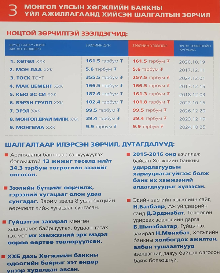 Тэгвэл тус компани хөгжлийн банкнаас 5.6 тэрбум төгрөг зээлж авсан боловч зээлээ эргэн төлж барагдуулаагүйгээр барахгүй , ажилтнуудынхаа хөдөлмөрлөсөн хөлсийг нь ч төлдөггүй аж.