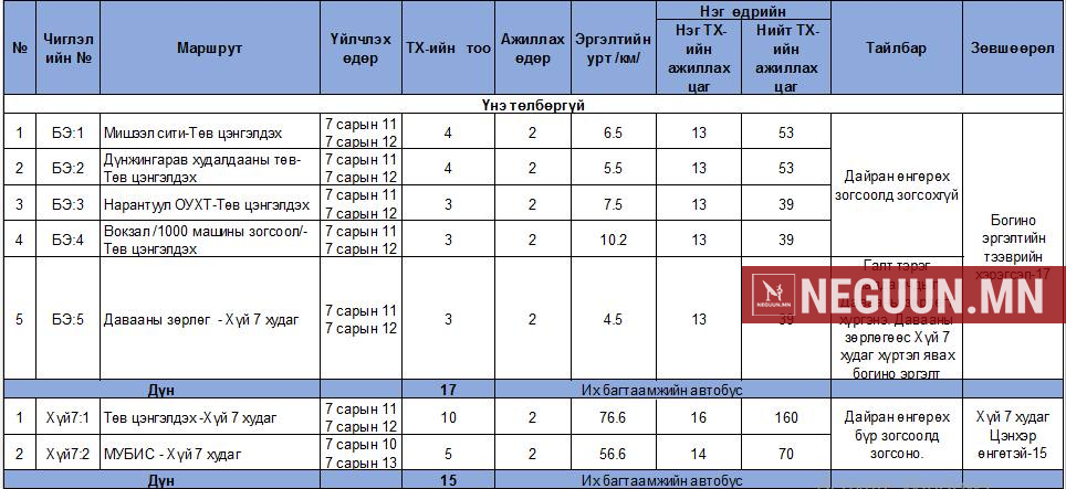 Тулгар төрийн 2230, 2231, Их Монгол Улсын 815, 816 жил, Ардын хувьсгалын 100, 101 жилийн ой, Үндэсний их баяр наадмын өдрүүдэд нийтийн тээврийн үйлчилгээнд үндсэн /хотын доторх болон хот орчмын/ 107 чиглэлд их, дунд багтаамжийн 674, зуслангийн гурван чиглэлд тав, шөнийн тээврийн үйлчилгээний гурван чиглэлд зургаа, нийт 685 автобус үйлчилгээнд ажиллуулахаар Нийслэлийн Нийтийн тээврийн газраас төлөвлөөд байна. БОГИНО ЭРГЭЛТИЙН АВТОБУС НААДАМЧДАД ҮНЭ ТӨЛБӨРГҮЙ Үндсэн чиглэлийн 685 автобус дээр нэмэлтээр зургаан чиглэлд 56 автобусыг наадамчдад зориулж явуулах юм. Эдгээрийн гурав нь богино эргэлтийн чиглэл байх бөгөөд богино эргэлтийн автобуснууд иргэдэд үнэ төлбөргүй үйлчилнэ. Тодруулбал, Дүнжингарав худалдааны төв-Төв цэнгэлдэх хүрээлэн, Вокзал-Төв цэнгэлдэх хүрээлэн, Хүй долоон худгийн Галт тэрэгний зогсоол буюу “Давааны зөрлөг”-өөс Морь барианы газар руу наадамчдад үнэ төлбөргүй үйлчилнэ. Зөвхөн богино эргэлтийн автобусанд иргэд үнэгүй зорчих юм. БОГИНО ЭРГЭЛТИЙН ЧИГЛЭЛҮҮДИЙН ТӨЛӨВЛӨЛТ / ҮНЭГҮЙ / ХҮЙ ДОЛООН ХУДАГ РУУ ЗӨВХӨН КАРТААР ҮЙЛЧИЛНЭ Хүй долоон худаг руу Төв цэнгэлдэх хүрээлэн, Боловсролын их сургууль, Таван шараас нийтийн тээврийн автобусаар үйлчлэх юм. Үйлчилгээний хөлс 1500 төгрөг бөгөөд төлбөрийг зөвхөн картаар төлнө гэдгийг мэргэжилтнүүд анхаарууллаа. Долдугаар сарын 11, 12-ны өдрүүдэд Төв цэнгэлдэх хүрээлэн буюу Гандийн гудамжны автобусны зогсоолоос 10 автобус долоон минут тутамд, долдугаар сарын 13-ны өдөр хотын төв “МУБИС”-ийн баруун тал буюу “Улаанбаатар зочид буудал”-ын автобусны зогсоолоос 06:00 цагаас их багтаамжийн таван автобус 10 минут тутамд “Хүй долоон худаг” руу 1500 төгрөгийн тарифаар үйлчилнэ. Мөн долдугаар сарын 11-15-нд Хүй долоон худгийн шөнийн арга хэмжээнд зориулж 18:00-03:00 цагийн хооронд зургаан автобус “Таван шар-Хүй долоон худаг” чиглэлд үйлчилнэ. ХҮЙ 7 ХУДАГ ЧИГЛЭЛД ХҮРЭХ ЧИГЛЭЛҮҮДИЙН МЭДЭЭЛЭЛ /1500 ТӨГРӨГ / ГЭРЭЭТ БАЙГУУЛЛАГЫН ТАКСИ ЗАМ ХААСАН ЧИГЛЭЛД Ч ЗОРЧИНО Төв цэнгэлдэх хүрээлэн орчим болон Таван шарын дөрвөн түр зогсоолоос Нийслэлийн Нийтийн тээврийн газартай гэрээтэй ажилладаг найман аж ахуйн нэгжийн 383 такси иргэдэд үйлчилнэ. Албан ёсны гэрээт байгууллагын таксинууд зам хаасан чиглэлд үйлчлэх бөгөөд эрх авсан 180 такси байгаа аж. Такси үйлчилгээний зогсоолууд: Төв цэнгэлдэх хүрээлэнгийн урд тал: Нийслэлийн гудамж, “Хурд” хорооллын хойд зогсоол; Төв цэнгэлдэх хүрээлэнгийн хойд тал: Махатма Гандийн гудамж, “Ж” зогсоолын баруун талын зогсоол Төв цэнгэлдэх хүрээлэнгийн баруун тал: Чингисийн өргөн чөлөө, Наадам центрийн баруун талын зогсоол, Таван шарын хойд автобусны зогсоолын зүүн талаас албан ёсны гэрээ бүхий компанийн таксинууд үйлчилгээ үзүүлэх юм байна. Наадмын эхний хоёр өдөр Төв вокзалаас Давааны өртөө хүртэл галт тэрэг 2000 төгрөгийн тарифаар үйлчилнэ.