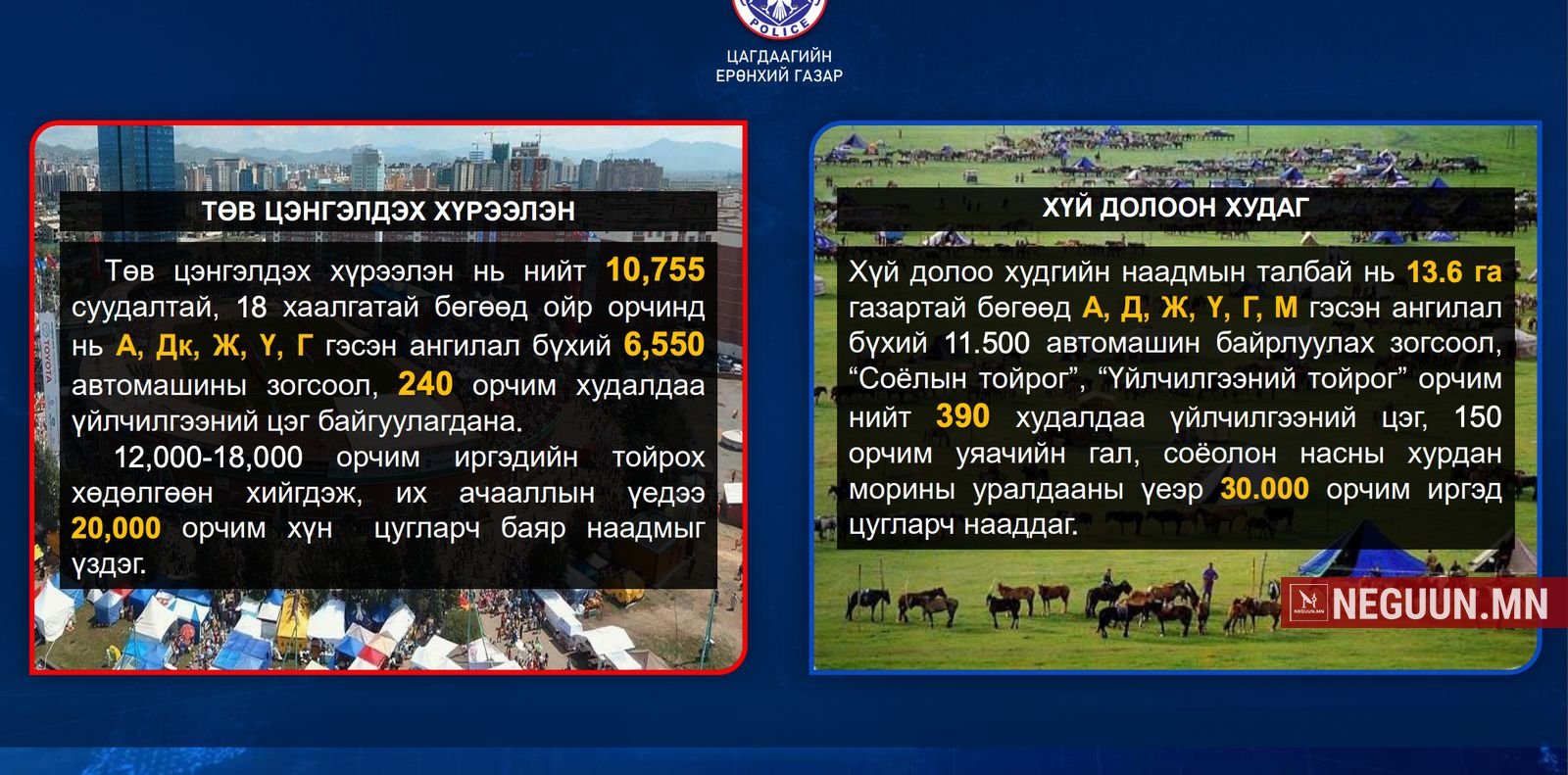 Үндэсний их баяр наадмын үеэр цагдаа, дотоодын цэргийн байгууллагаас зохион байгуулах арга хэмжээний талаар Нийслэлийн Цагдаагийн Удирдах Газар (НЦУГ)-аас өнөөдөр мэдээллээ.