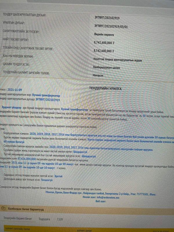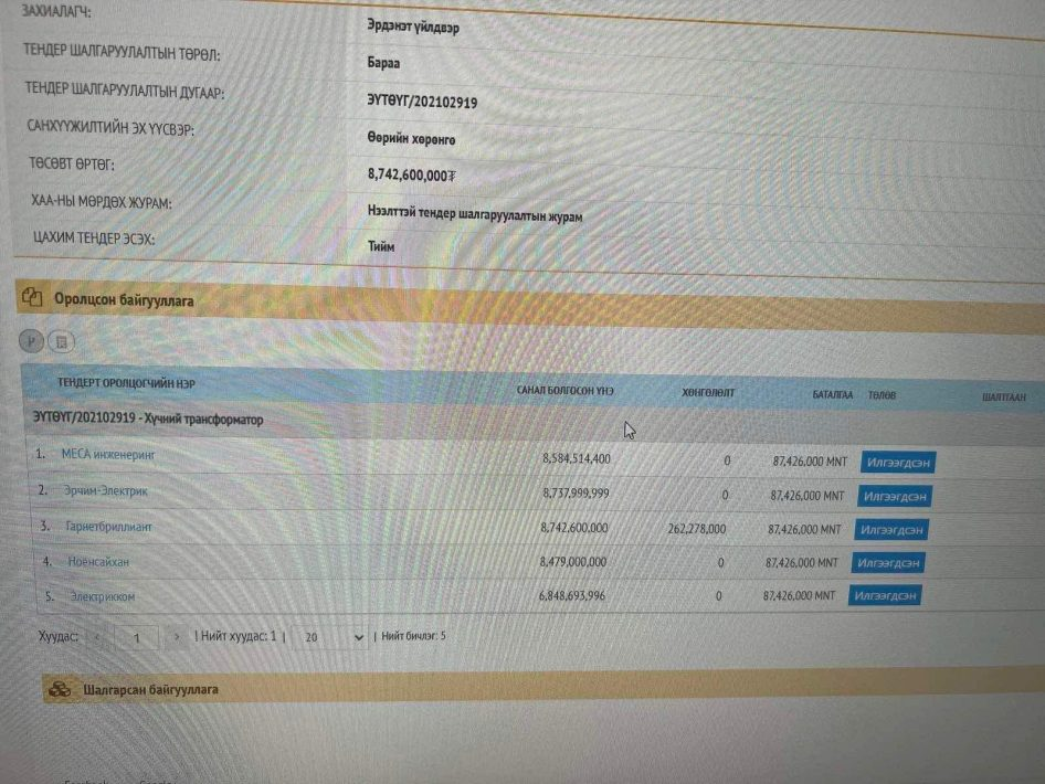 2021 оны 12 дугаар сарын 09-нд Эрдэнэт төрийн өмчит үйлдвэрт шаардлагатай байгаа “Хүчний трансформатор” нээлттэй тендерт МЕСА инженеринг/8,584,514,400/, Эрчим электрик /8,737,999,999/ , Гарнетбрилиант /8,742,600,000/, Ноёнсайхан /8,479,000,000/, Электрикком/6,848,693,996/ гэсэн үнийн санал өгөн өрсөлдсөн байдаг.