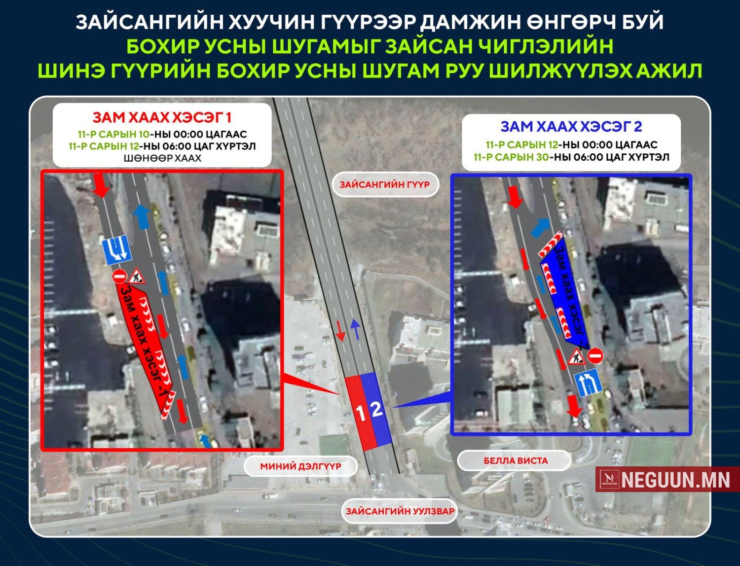 Зайсангийн төмөрбетон гүүрийн өргөтгөл шинэчлэлтийн ажлын талаар НЗХГ-ын Гүүрийн хяналтын мэргэжилтэн Б.Жаргалдүүрэн “Зайсангийн иргэдийн хэрэглэж байгаа бохир усны шугамыг шинэ татсан шугамтай холбох ажлыг гүйцэтгэх хүрээнд энэ сарын 8-12-ны өдрүүдэд шөнийн цагаар шинэ гүүрний хэсэг болох баруун хэсгийн шугам холболтын ажлыг гүйцэтгэж байгаа бөгөөд өдрийн цагаар хөдөлгөөнийг хэвийн үргэлжлүүлж байна. Харин маргааш буюу арваннэгдүгээр сарын 12-ны 00:00 цагаас эхлэн Зайсангийн гүүрний хот чиглэл буюу хуучин гүүрнээс урагш уулзвар хүртэлх авто замын зорчих хэсгийн тал хэсгийг 20 метр орчим хааж, бохирын шугам угсралт болон худаг байгуулах ажлыг хийнэ. Энэ хугацаанд замын хөдөлгөөнийг сөрөг хөдөлгөөнөөр зорчуулах бөгөөд хоёр гүүрний хөдөлгөөн хэвийн үргэлжилнэ” хэмээв.