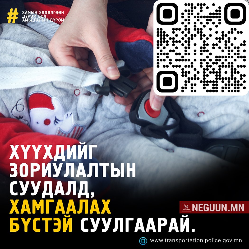 Хүүхдийг зориулалтын суудалд, хамгаалах бүстэй суулгаж хөдөлгөөнд оролцуулах /сэрэмжлүүлэх бичлэг, стикерийг QR SCAN/