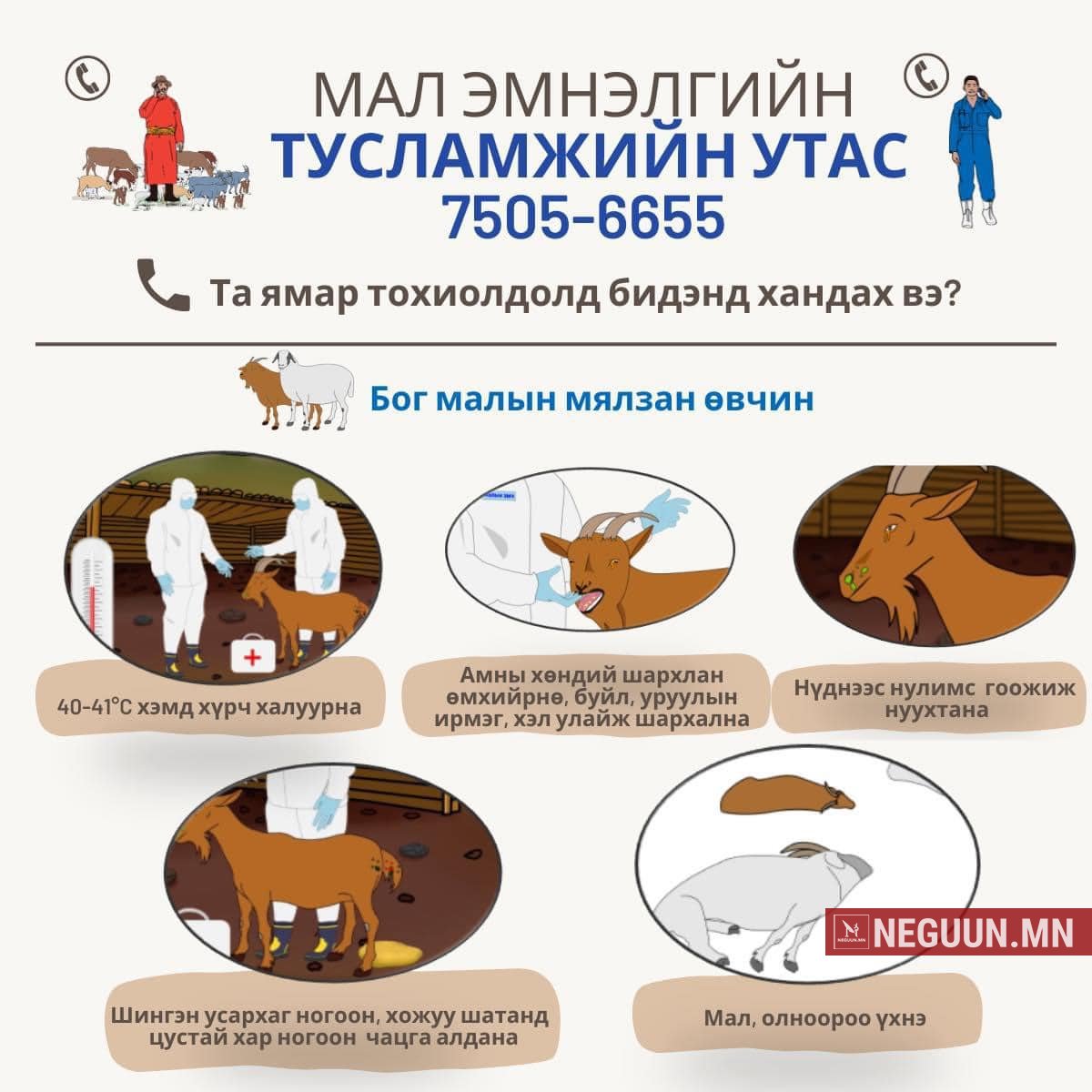 Мал эмнэлгийн ерөнхий газар мал, амьтны эрүүл мэндэд хамаарах асуудлаар малчид, иргэдийг сонсох, тэдэнд тулгамдсан асуудлыг шуурхай шийдвэрлэх, мал, амьтны гоц халдварт өвчний тохиолдлыг эрт илрүүлэх зорилгын хүрээнд Дэлхийн банкны МАА ЭЗЭН төслөөс санхүүжүүлж, “Мал эмнэлгийн тусламжийн утас” идэвхгүй тандалтын туршилтын төслийн үйл ажиллагааг өнөөдрөөс эхлүүлж байна.