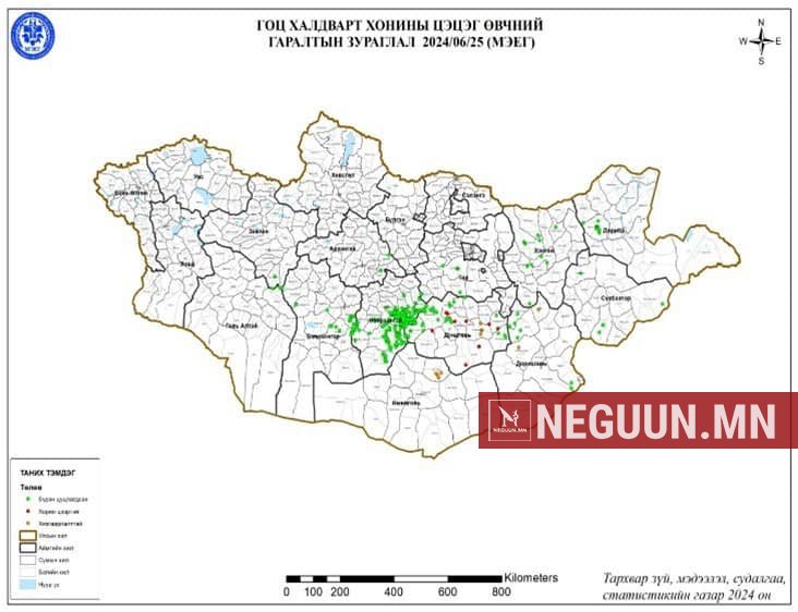 Улсын хэмжээнд өнөөдрийн байдлаар 12 аймгийн 71 сумын 91 голомтод 401 өрхийн нийт 11951 толгой мал өвчилж, голомтын хорио цээрийн дэглэм бүрэн цуцлагдаж тус өвчнөөр тайван байна.