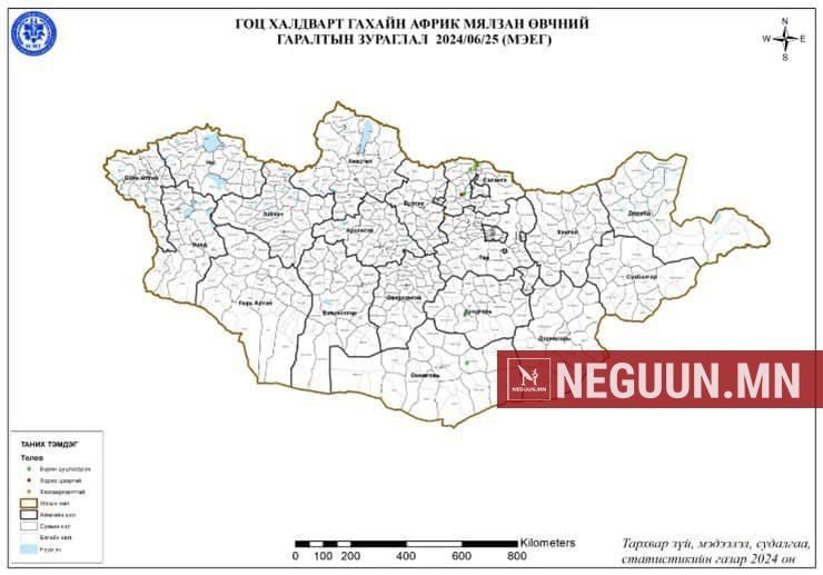 Улсын хэмжээнд 2 аймгийн 5 сумын 5 голомтод 12 өрхийн 241 толгой гахай өвчилж, өвчилсөн бүх гахайг устгалд оруулж орчны ариутгал, халдваргүйтгэл хийсэн.