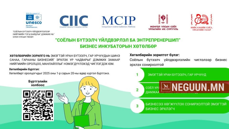 ЮНЕСКО-ийн дэргэдэх Соёлын олон төрлийг дэмжих “Соёлын бүтээлч үйлдвэрлэлээр нийгмийн тэгш байдлыг дэмжих нь” төслийн хүрээнд хэрэгжүүлэх “СОЁЛЫН БҮТЭЭЛЧ ҮЙЛДВЭРЛЭЛ БА ЭНТРЕПРЕНЕРШИП” бизнес инкубаторын хөтөлбөрт эмэгтэй уран бүтээлч, гар урчууд, бизнес эрхлэгч болон оюутнуудыг урьж байна.