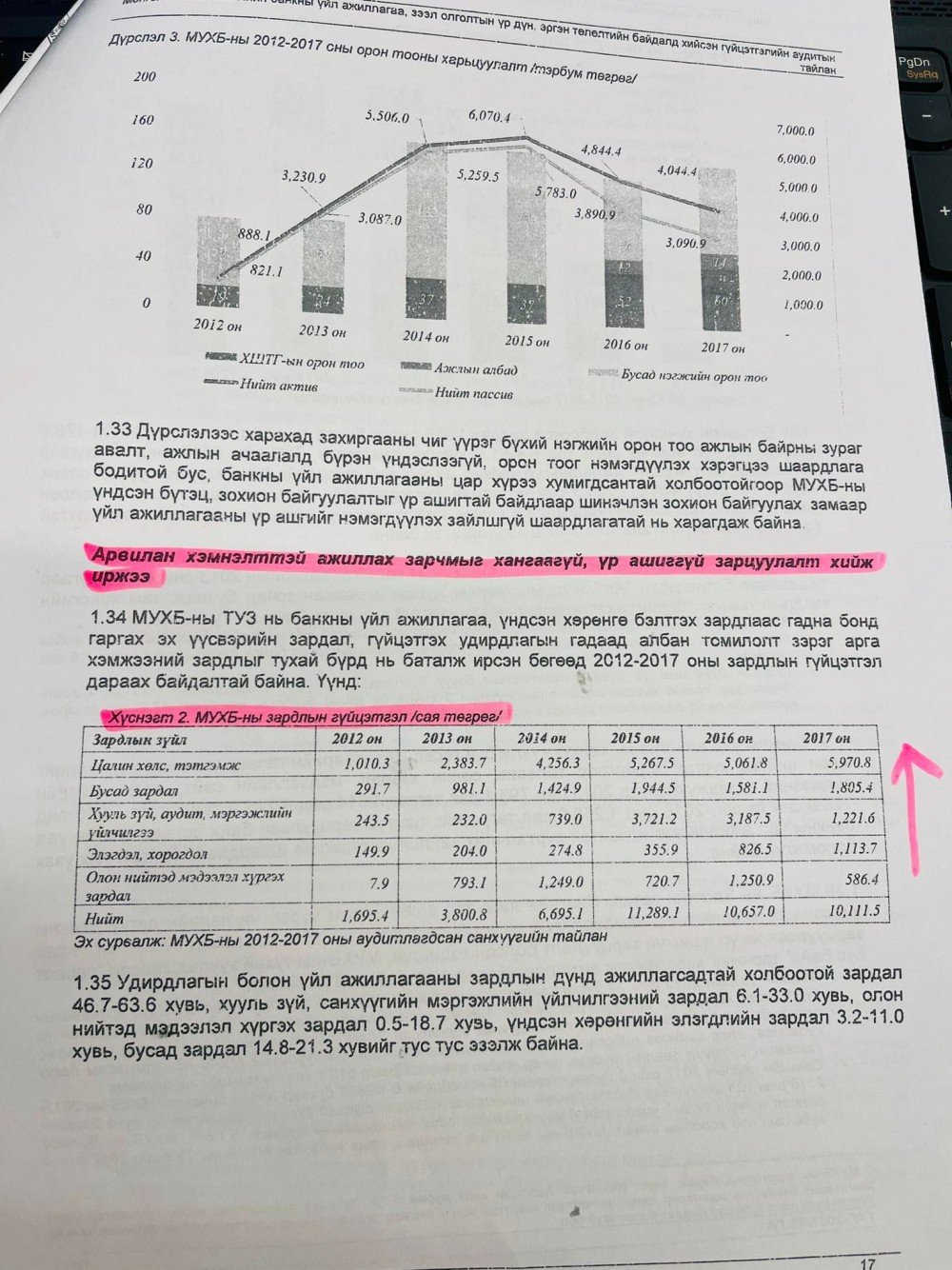 - Банкны үйл ажиллагаа хумигдаж, татан төвлөрүүлэх хөрөнгө болон зээл олголт буурсаар байхад банкны зохион байгуулалтын бүтцийг 4 газар, 3 алба, 13 хэлтэс бүхий 157 орон тоотой байхаар баталсан/2017 он/ ;